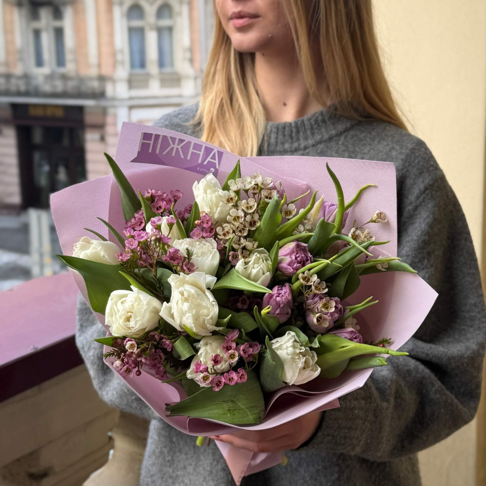 - Як замовити Мікс тюльпанів з хамелаціумом у букеті «Обійми»? ❯