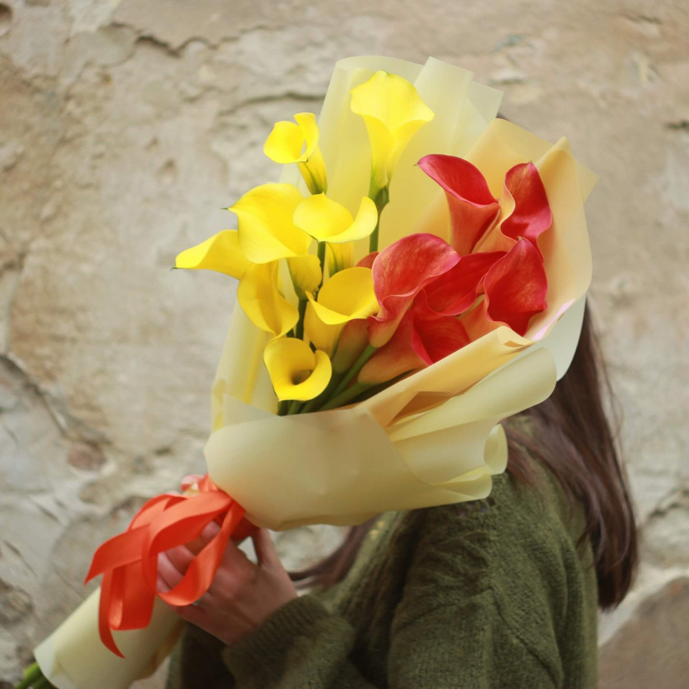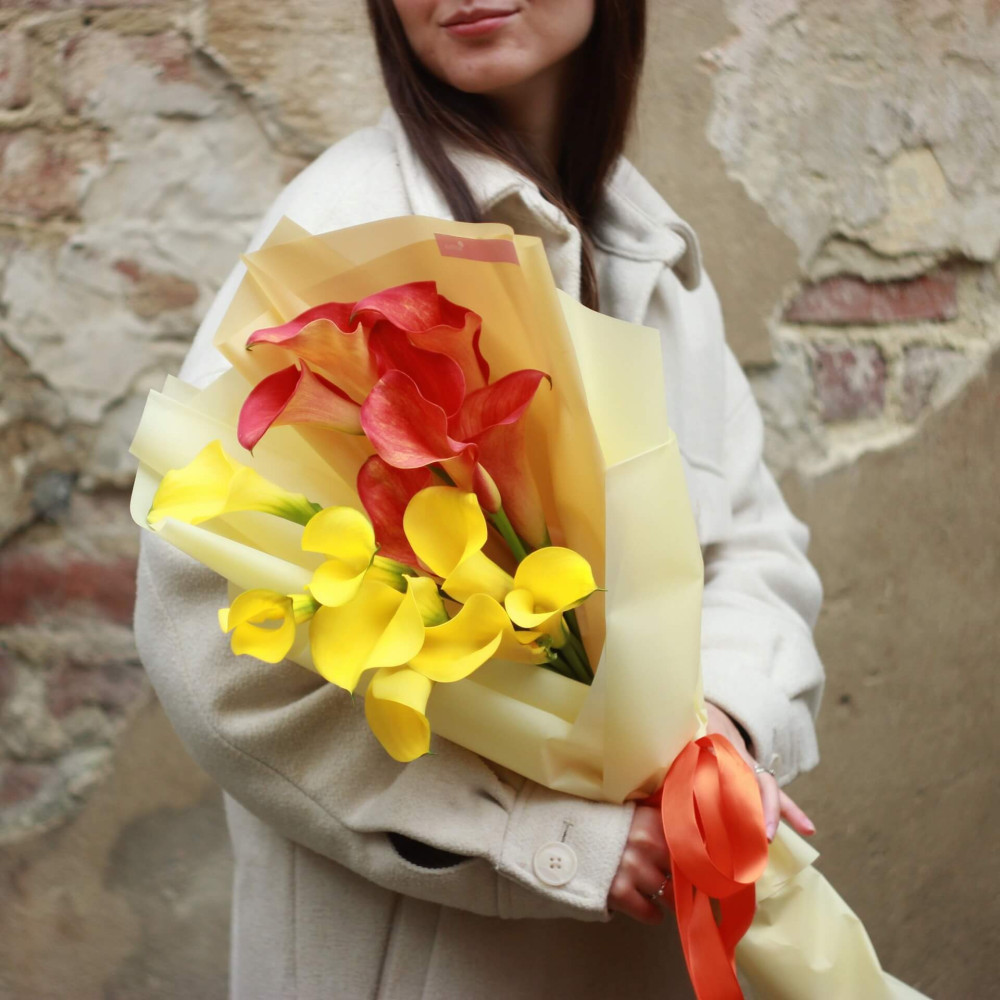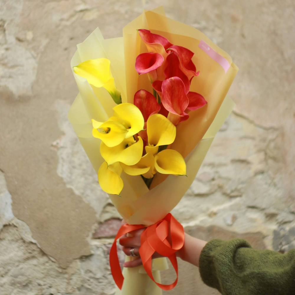 Невеликий букет з яскравих кал - відмінний привід замовити квіти з доставкою по Львову
