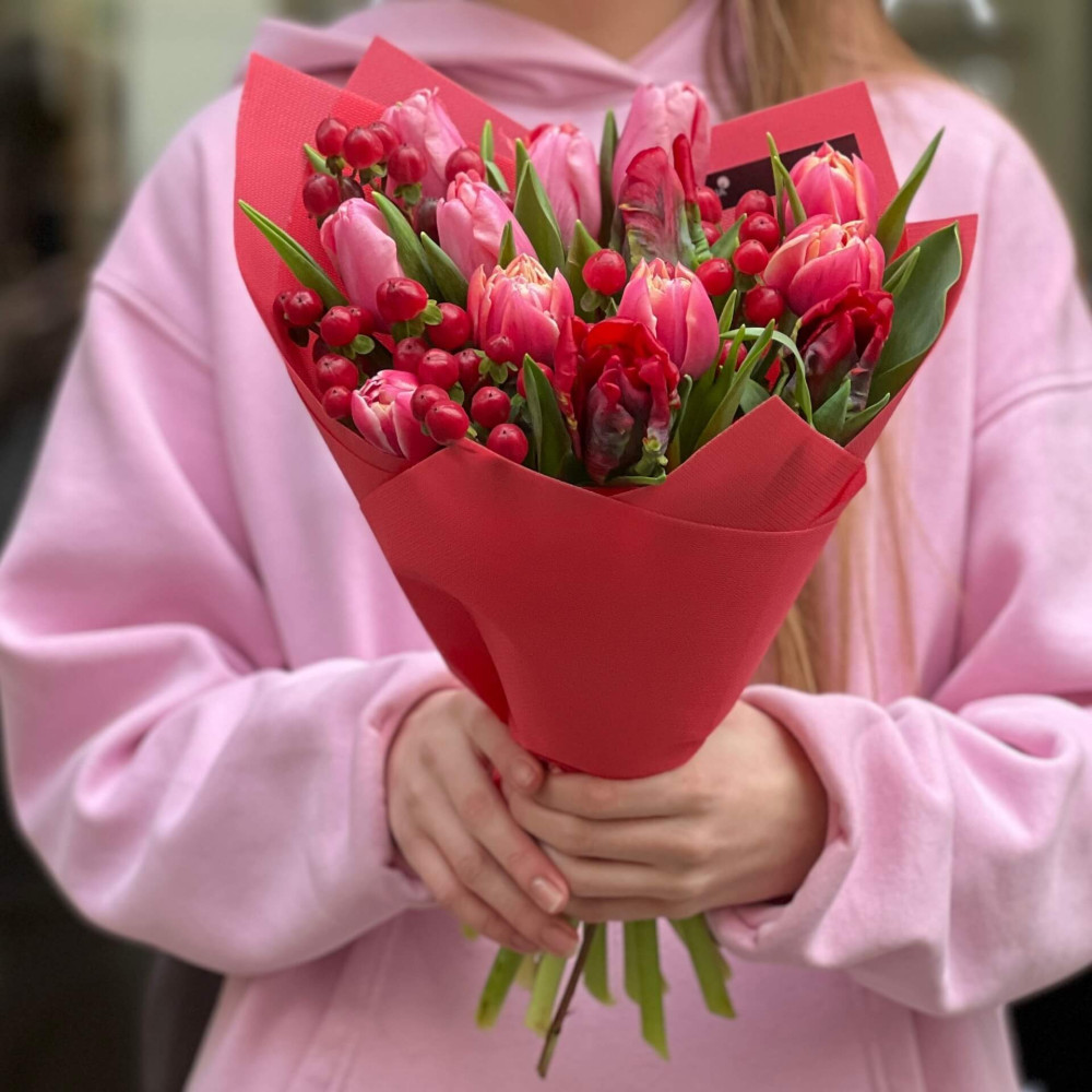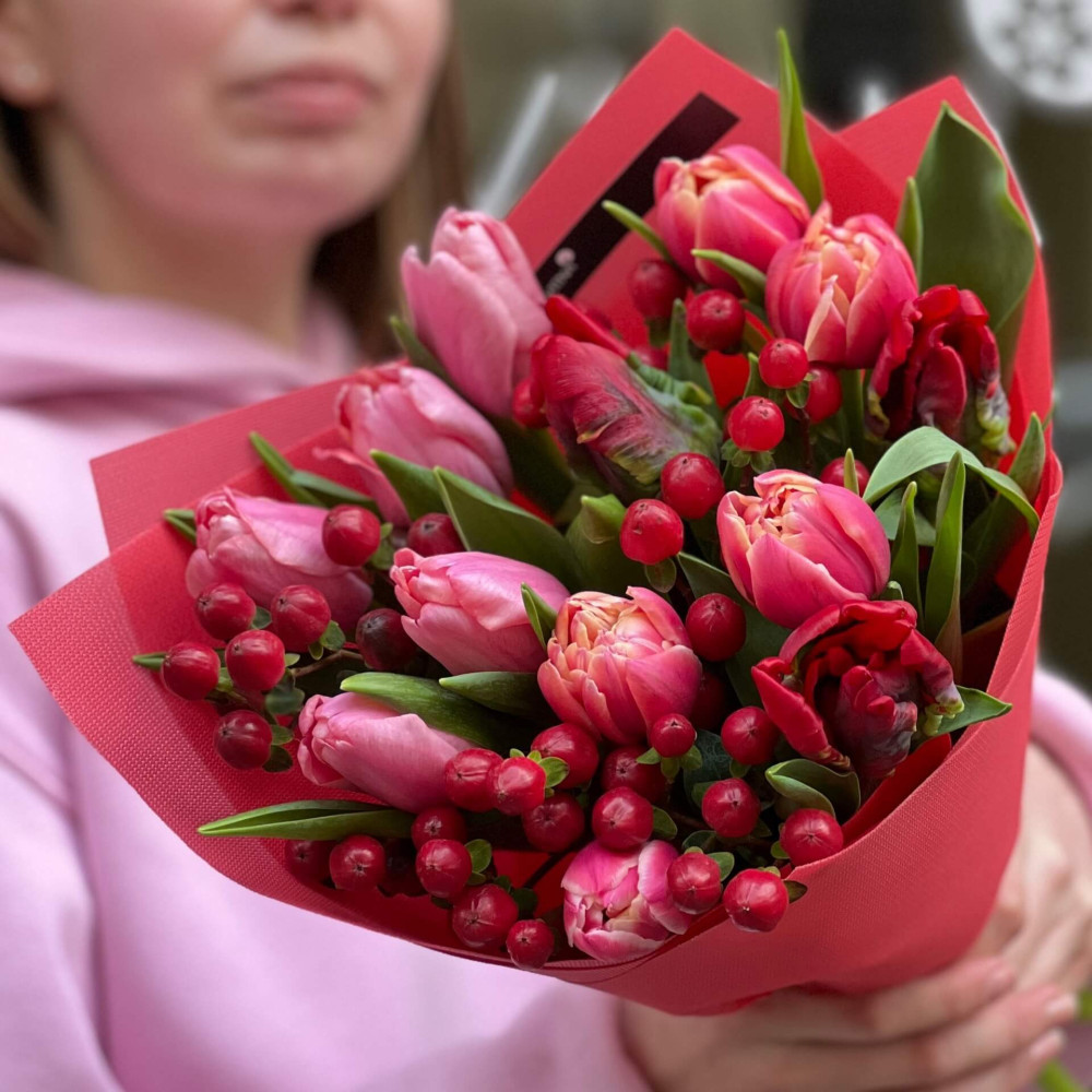 - Як замовити Милий букет з тюльпанами та хіперікумом «Рубінові ягідки»? ❯