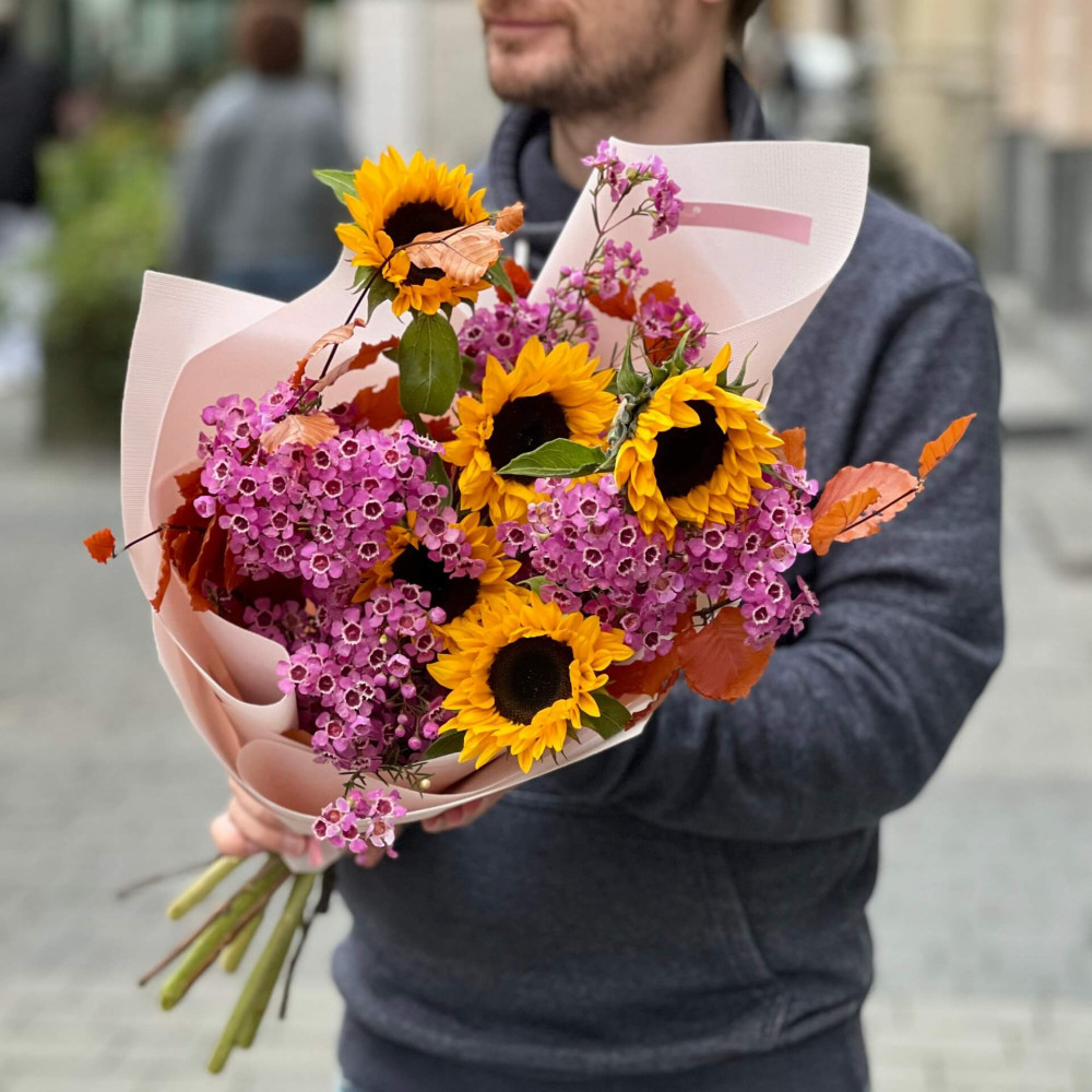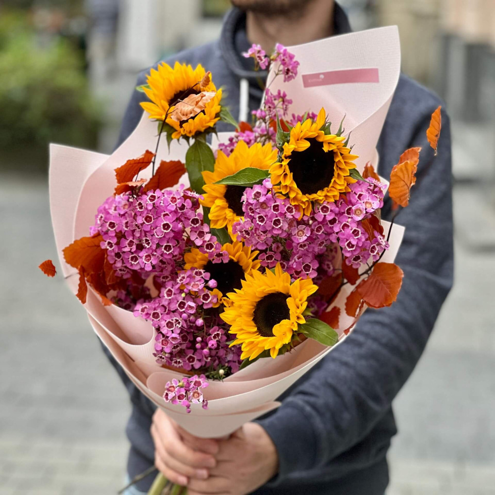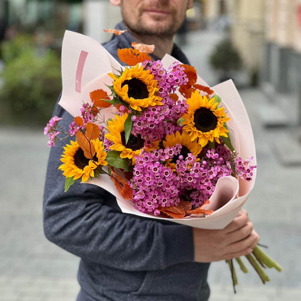 - Як замовити Милий букет з соняшниками та хамелаціумом «Нотка осені»? ❯