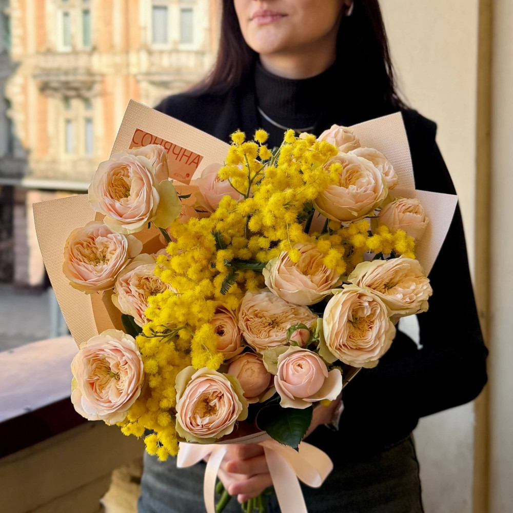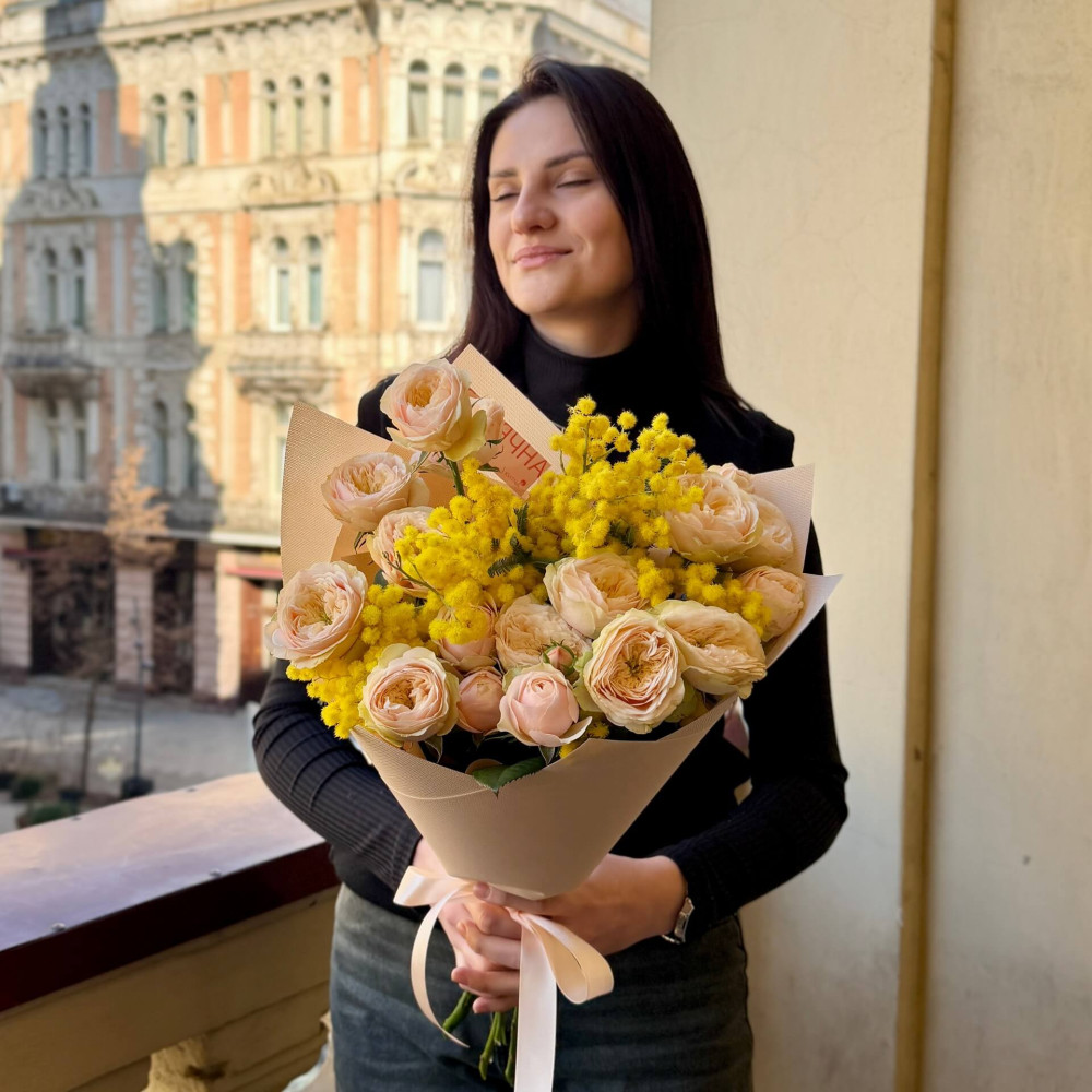 - Як замовити Милий весняний букет із піоновидною кущовою трояндою Darlington? ❯