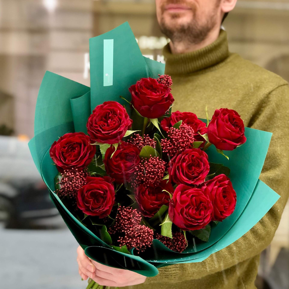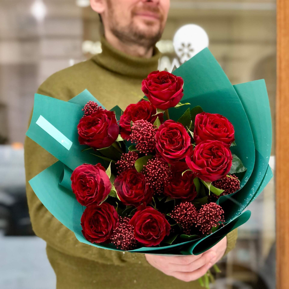 Квіти: Троянда піоновидна Mayra Red - 11 шт., Скімія