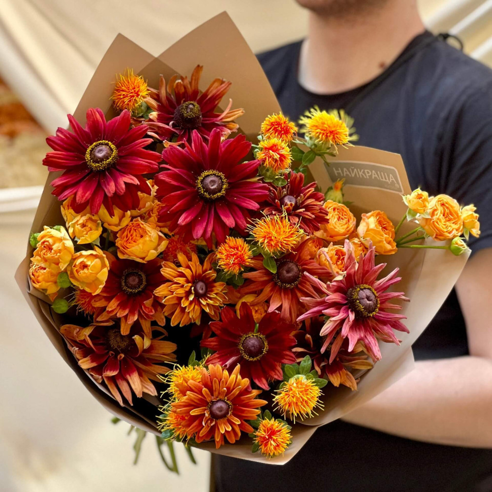 Квіти: Троянда піоновидна кущова, Рудбекія, Картамус