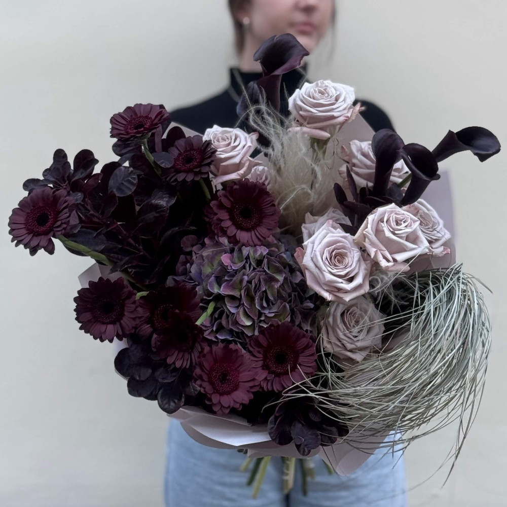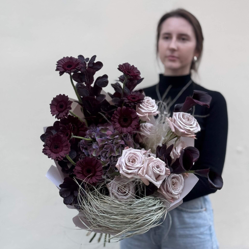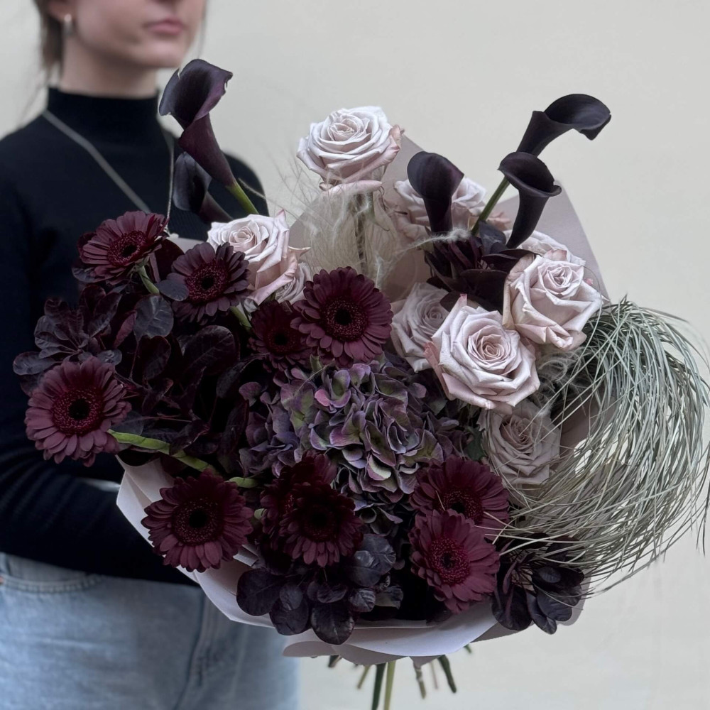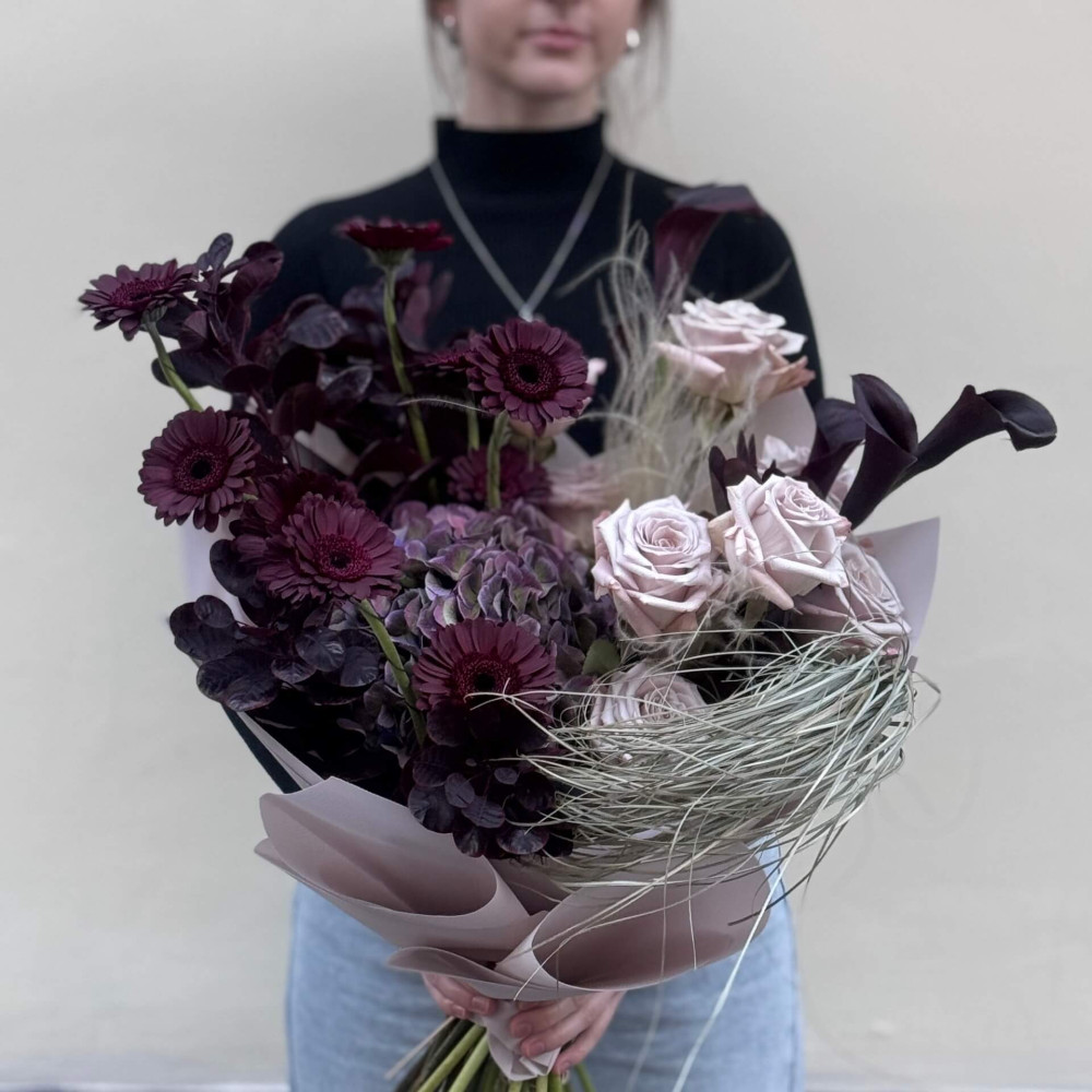 - Як замовити Неординарний стильний букет з бордовими герберами Dark Night «Серце чарівниці»? ❯