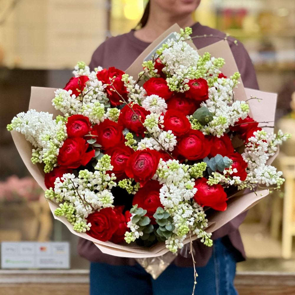- Як замовити Неймовірний букет з ранункулюсів та бузку «Справжнє кохання»? ❯