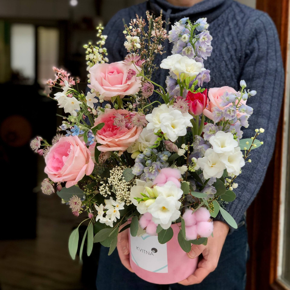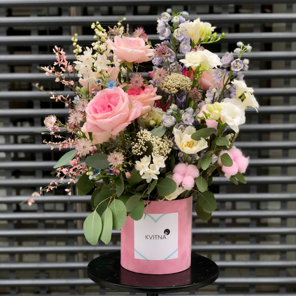 Нехай композиція (коробка, кошик, сніп) з квітами від Квітна тішить Вас якнайдовше!