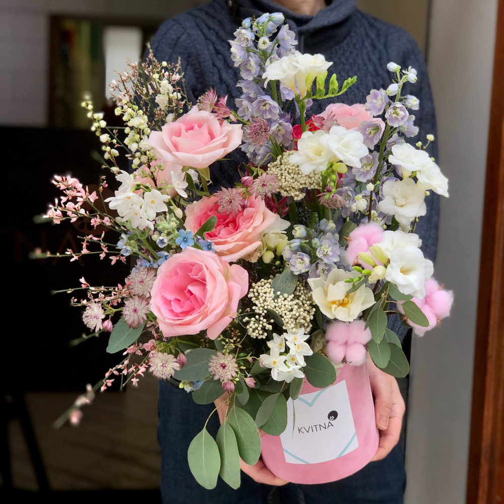 - Композиції з квітів від Kvitna (такі як коробка, кошик, сніп) зібрані у флористичній піні, просоченій водою, тому вони не потребують вази. Оскільки вода випаровується, потрібно підливати в піну по склянці прохолодної води щодня.