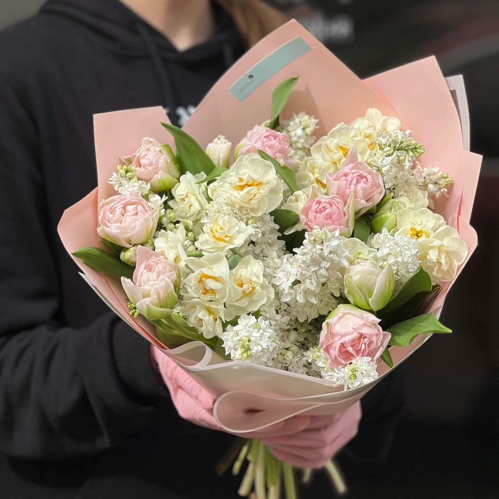 Тріо весняних квітів - білий бузок, ніжний рожевий тюльпан та ароматний кущовий нарцис. Це радість Іринки від чудової весни.