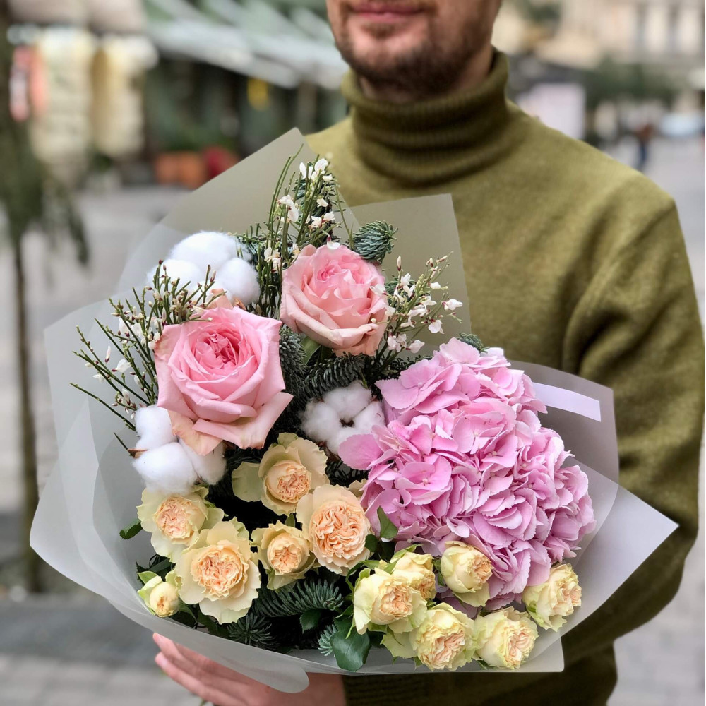 Повітряна пишна гортензія з абрикосовим відтінком кущової троянди та солодким ароматом півонієподібної троянди Пінк Охара – як смачна і легка зефірка з літніх фруктів. Я твоя солодкість.