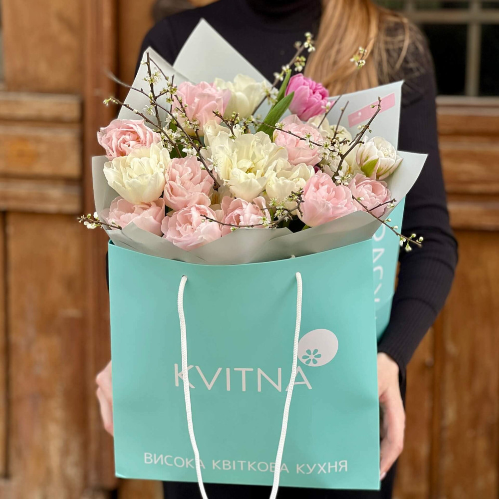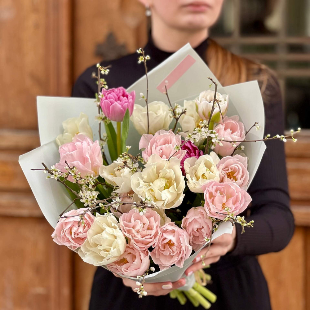 - Як замовити Ніжний букет із піоновидних тюльпанів і квітучих гілочок «Японська весна»? ❯