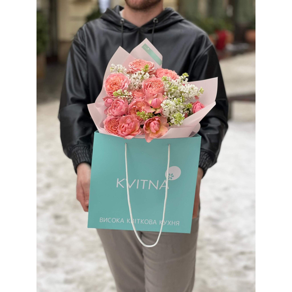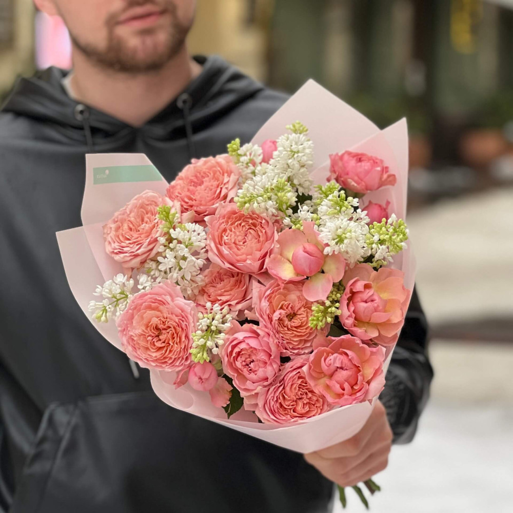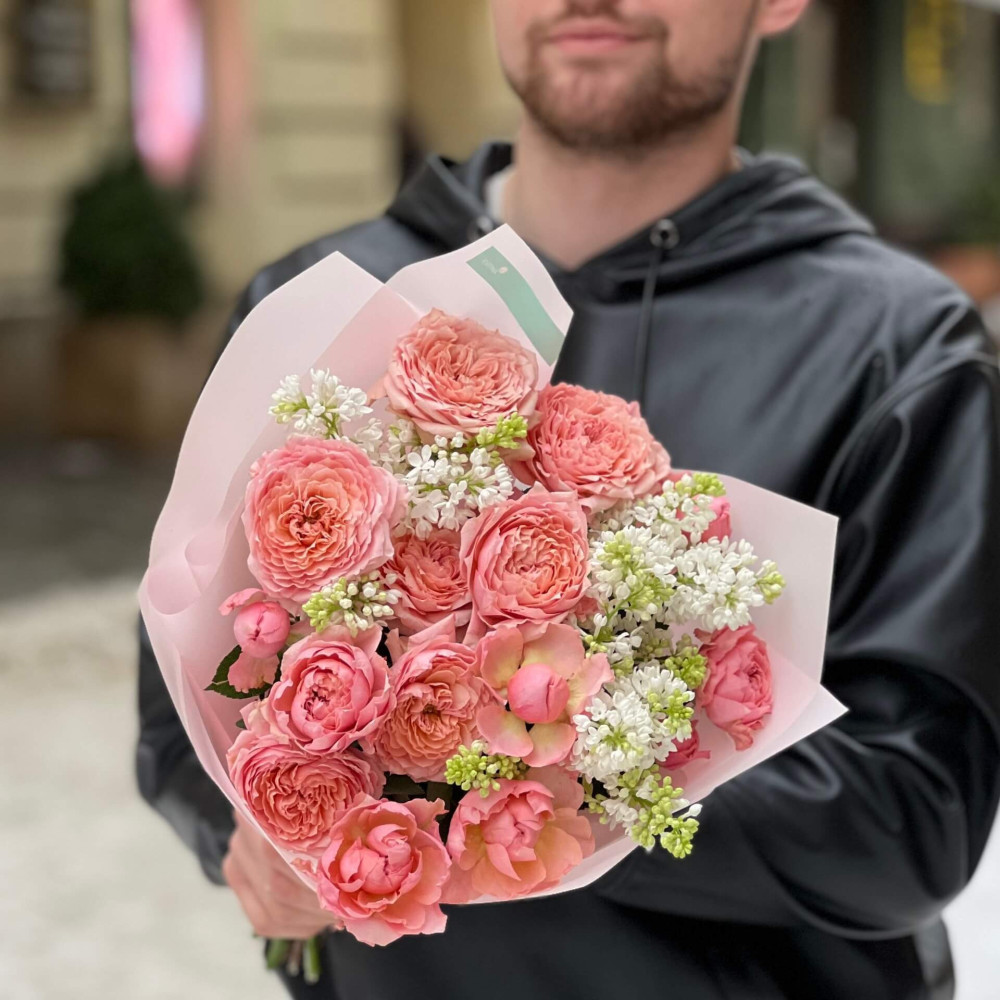 - Як замовити Ніжний букет із піоновидної кущової троянди Джульєтта і запашного бузку «Персикова весна»? ❯