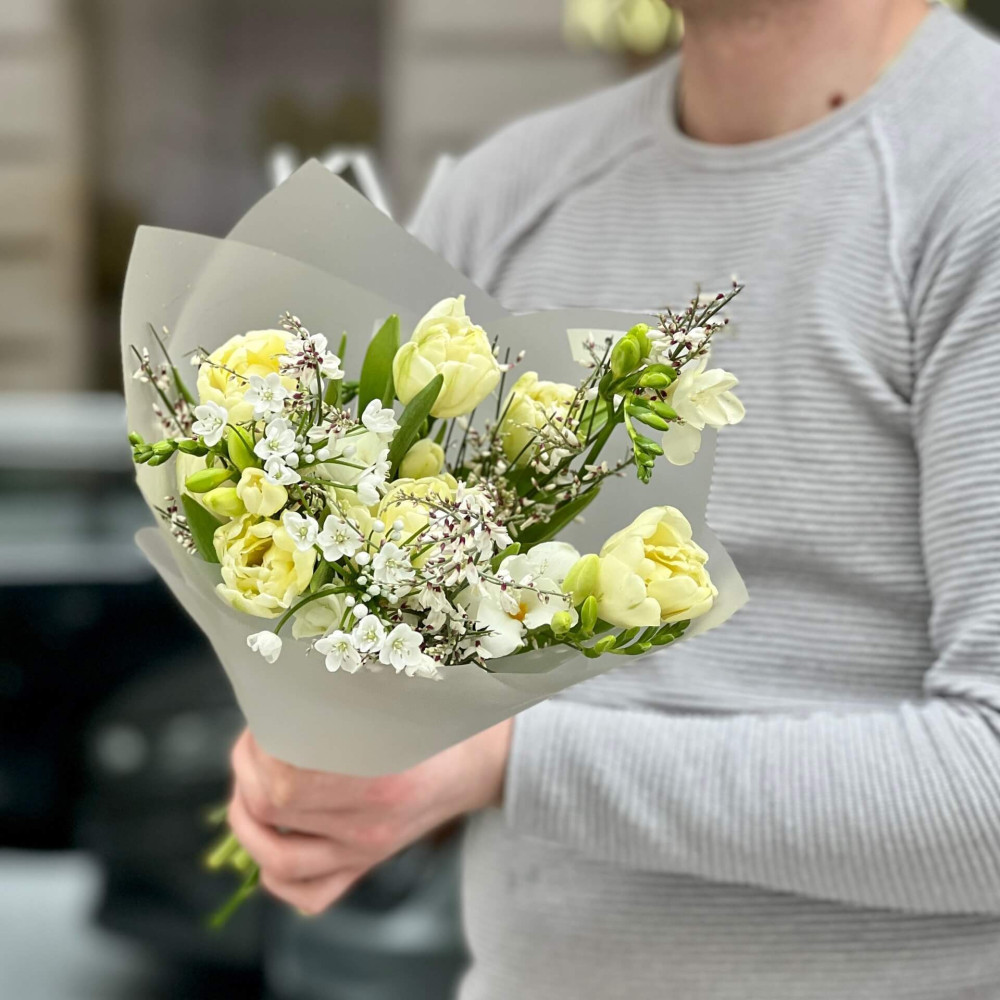 Поєднання кремових махрових тюльпанів, делікатних білих дрібних квіточок алліума та пахучої білої геністи творить ніжний весняний букет, яким можна привітати кохану з іменинами.