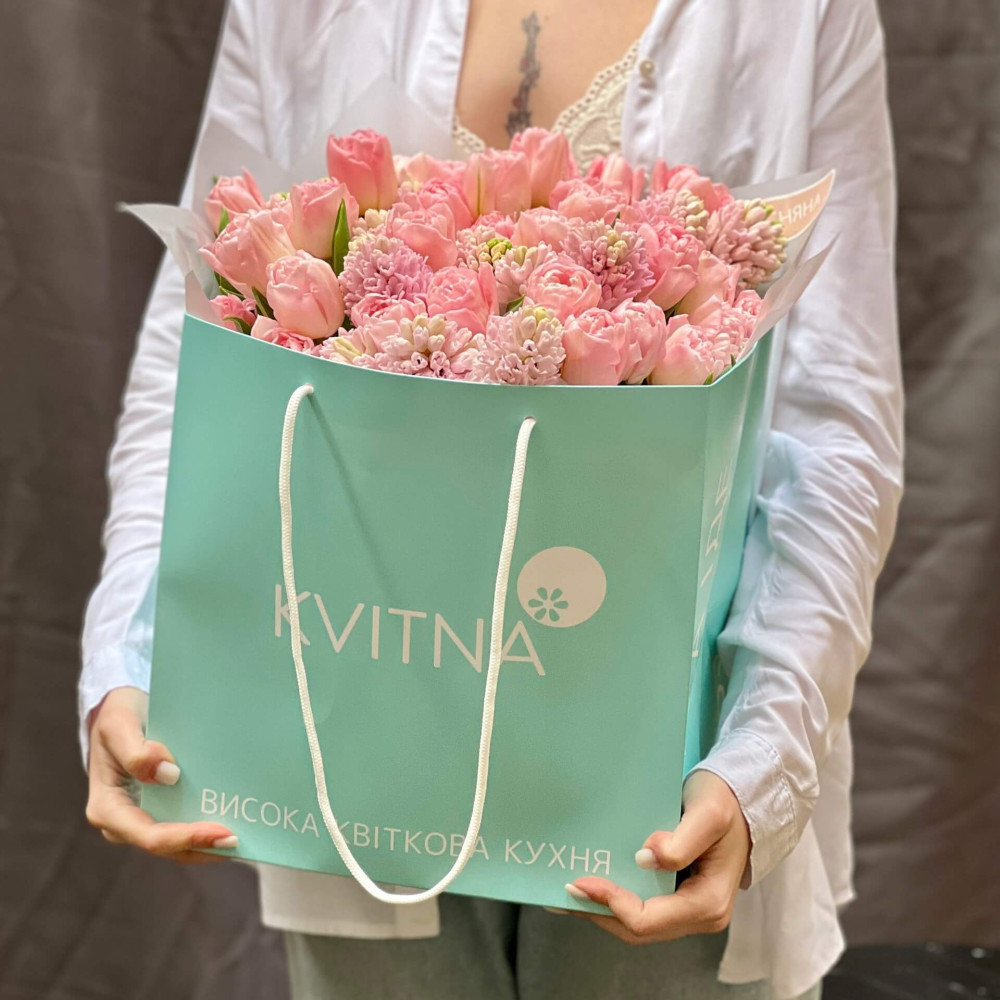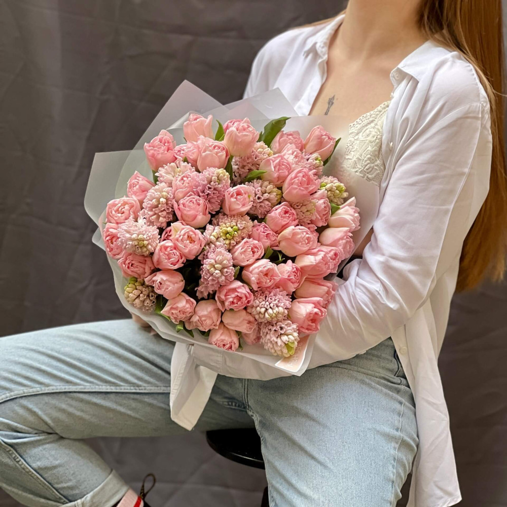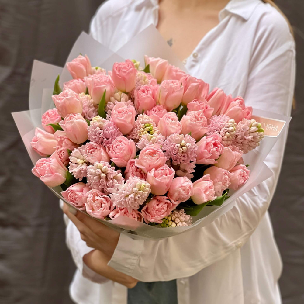 Чистий рожевий колір півонієподібних тюльпанів та дуже ароматних гіацинтів – романтичний і ніжний. Як перша любов.