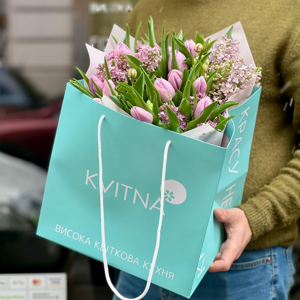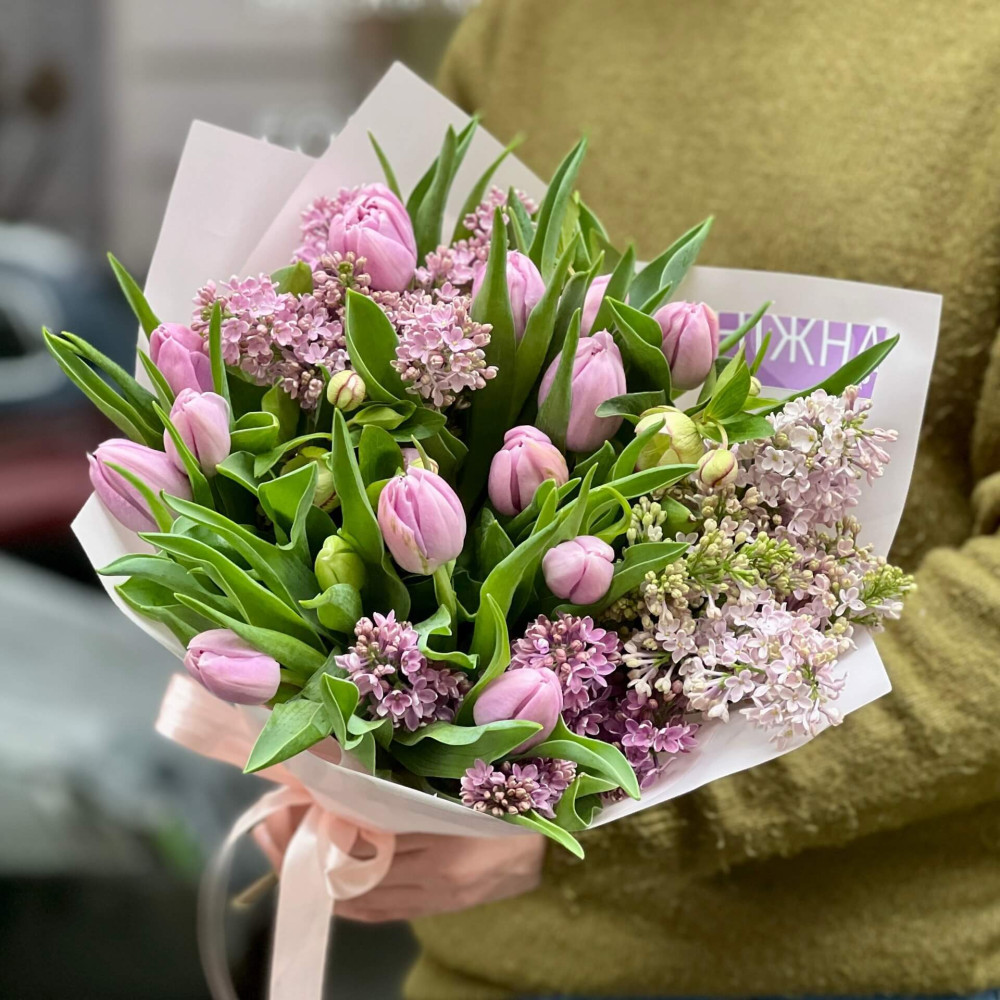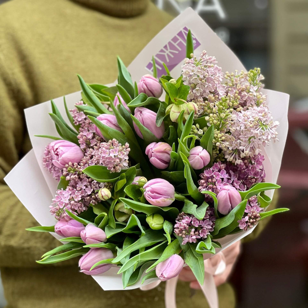 Лавандовий мікс тюльпанів та фіолетового бузку розповідає тобі про весняний сад, який пишно зацвітає після перших, по справжньому літніх днів.