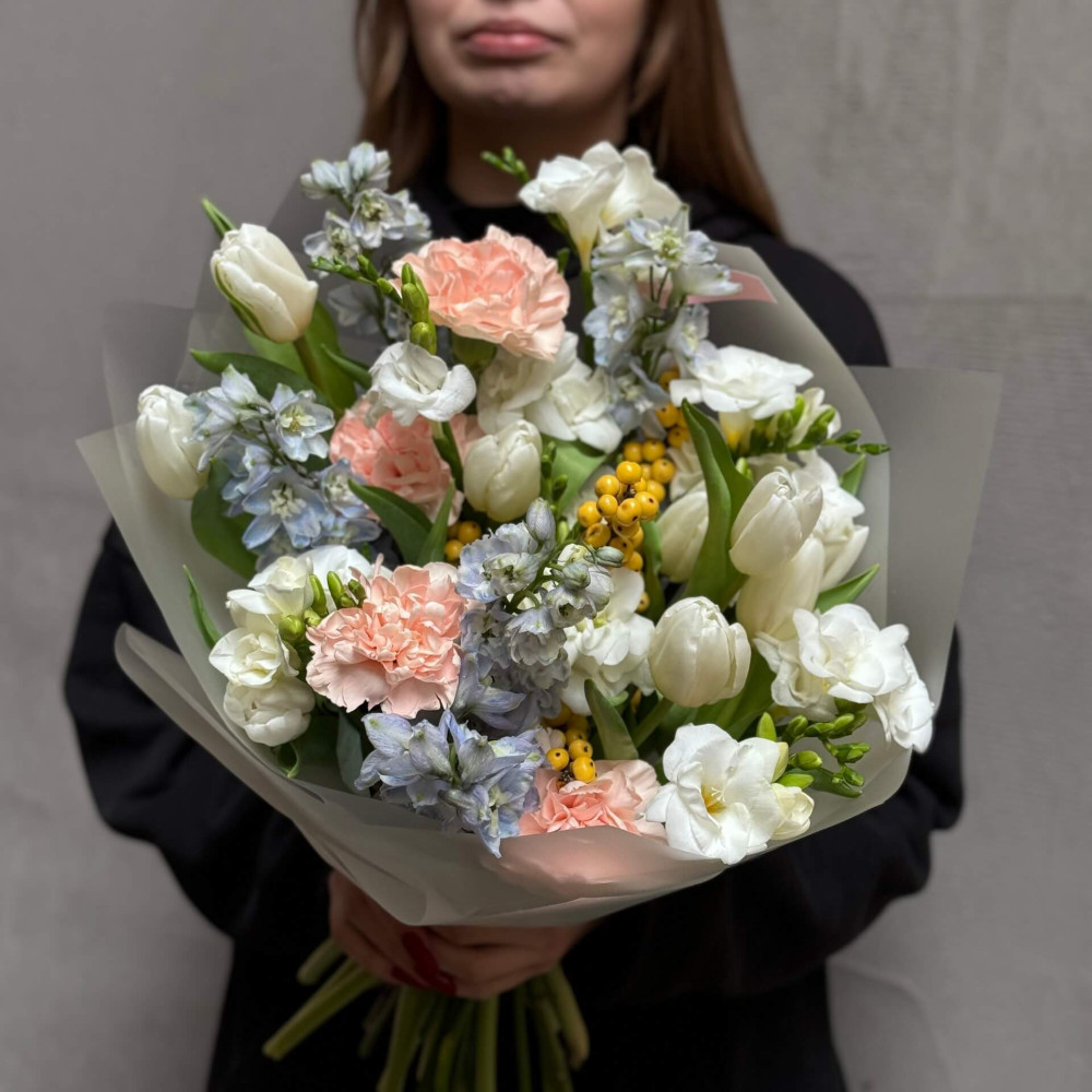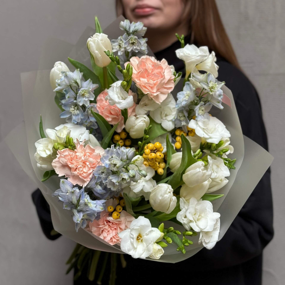 - Як замовити Ніжний букет з фрезією та дельфініумом «Вишуканий парфум»? ❯