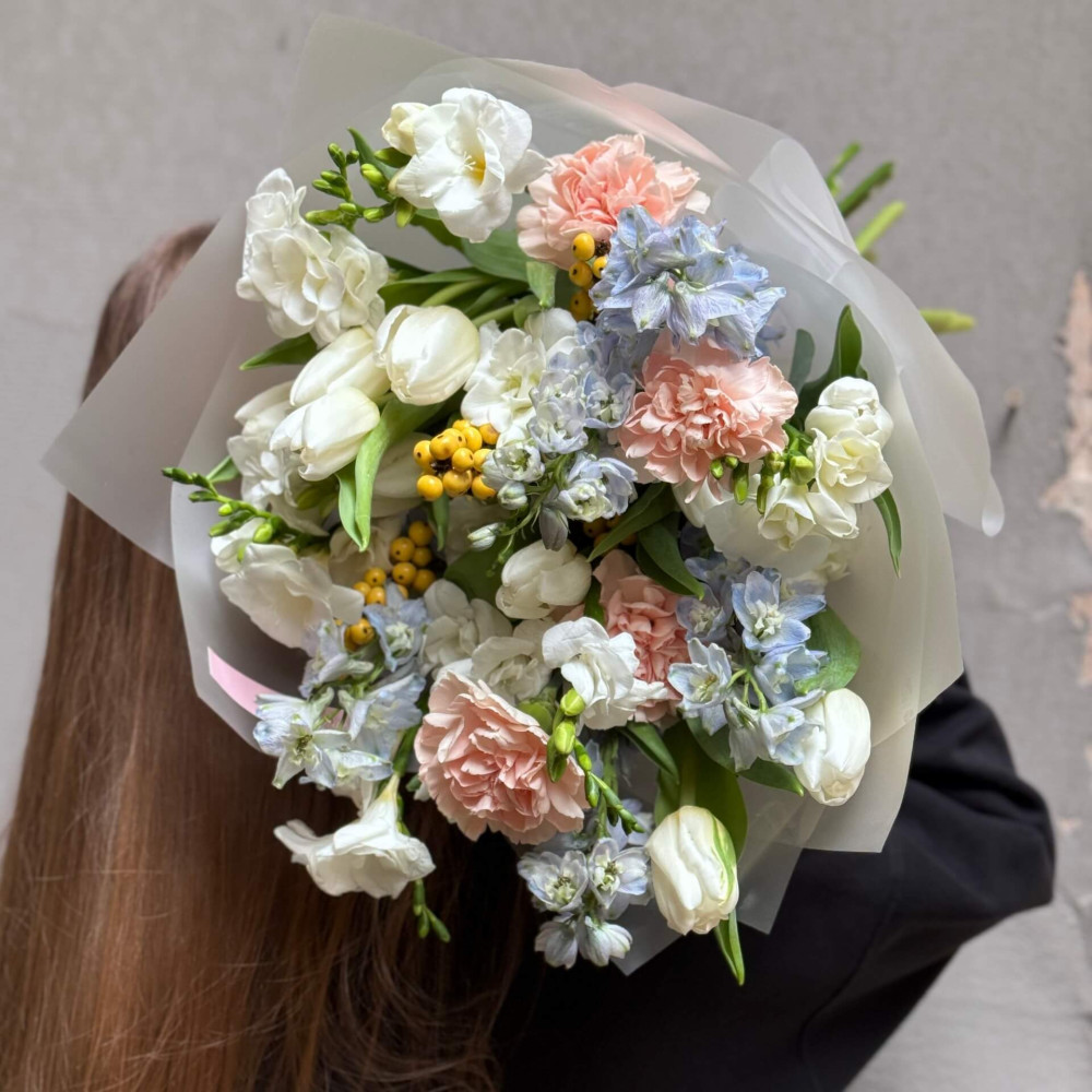 Квіти: Дельфініум, Фрезія, Діантус (Гвоздика), Тюльпан