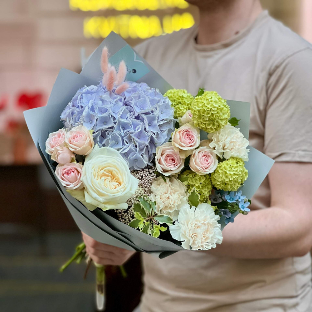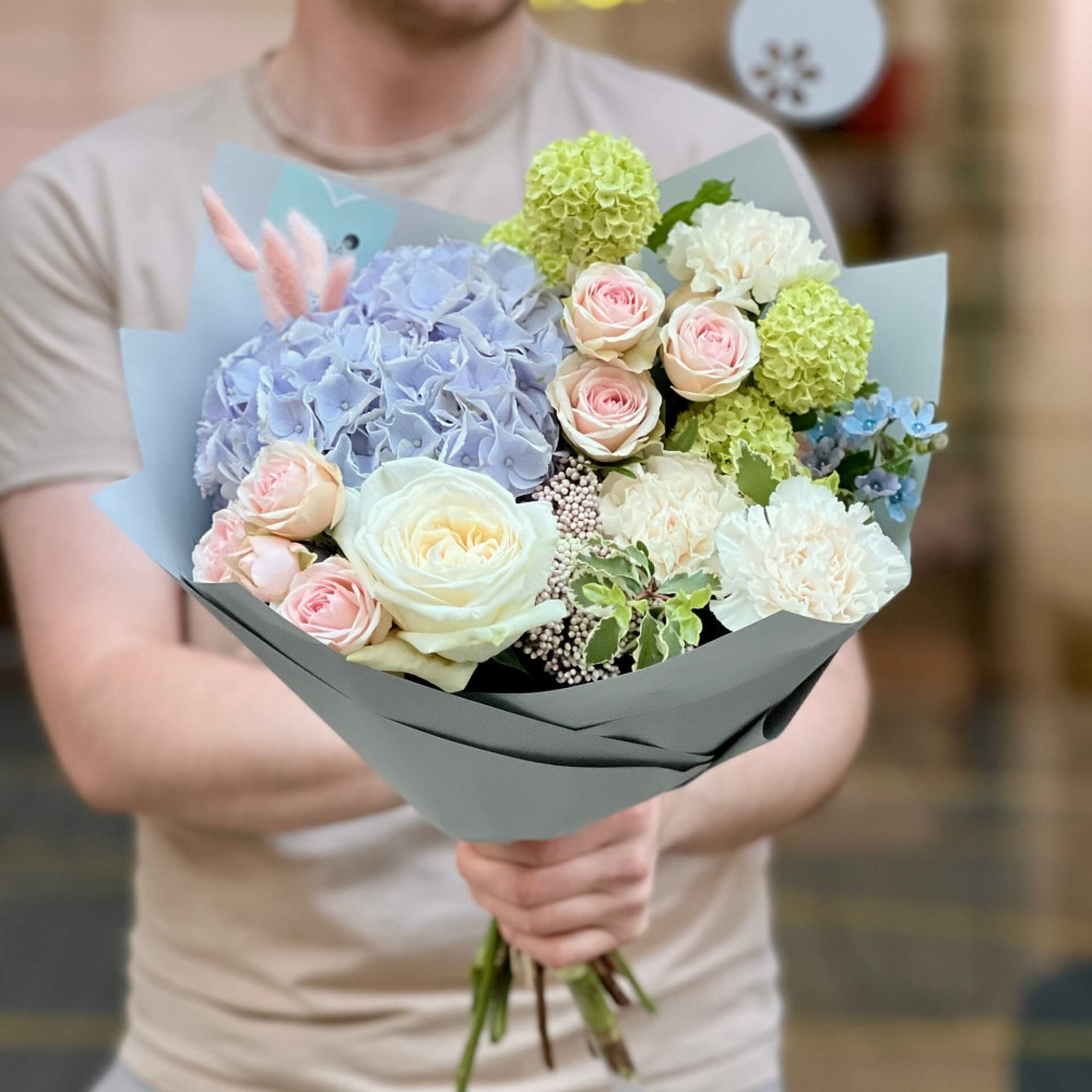 - Як замовити Ніжний букет з гортензією «Чарівна Іринка»? ❯