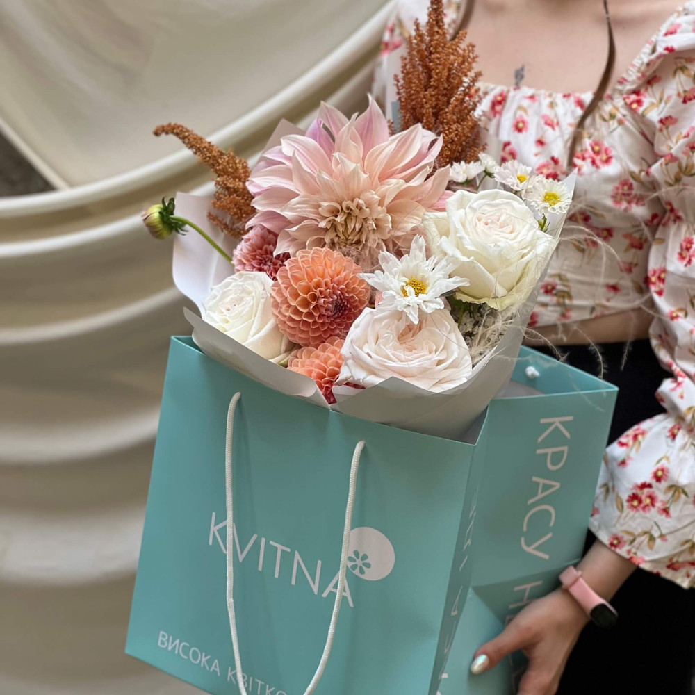 І це, до речі, зовсім не обов'язково плюси, це особливості, які потрібно розуміти. Тоді і вибір «де купити букет у Львові» зробити буде значно простіше.- Кожен букет Kvitna унікальний. Це означає, якщо Ви замовите у нас якийсь із букетів на сайті, то Ви не отримаєте точнісінько такий же. Деяких це бентежить, такі люди не хочуть «ризикувати», бажають «в точності, як на світлині». У «Квітна» кожен букет — це творчий пошук, це захоплення, злиття з квітами, образом одержувача і завданням. Так, ми можемо прийняти за вектор, зробити схожий букет, в тому ж стилі, кольоровій гамі, з тих самих квітів ... Але нам нудно робити за шаблоном. Адже букет, представлений на зображенні, робився для іншої людини, з іншого приводу, під інший настрій і натхнення. У Вас буде все по-іншому.