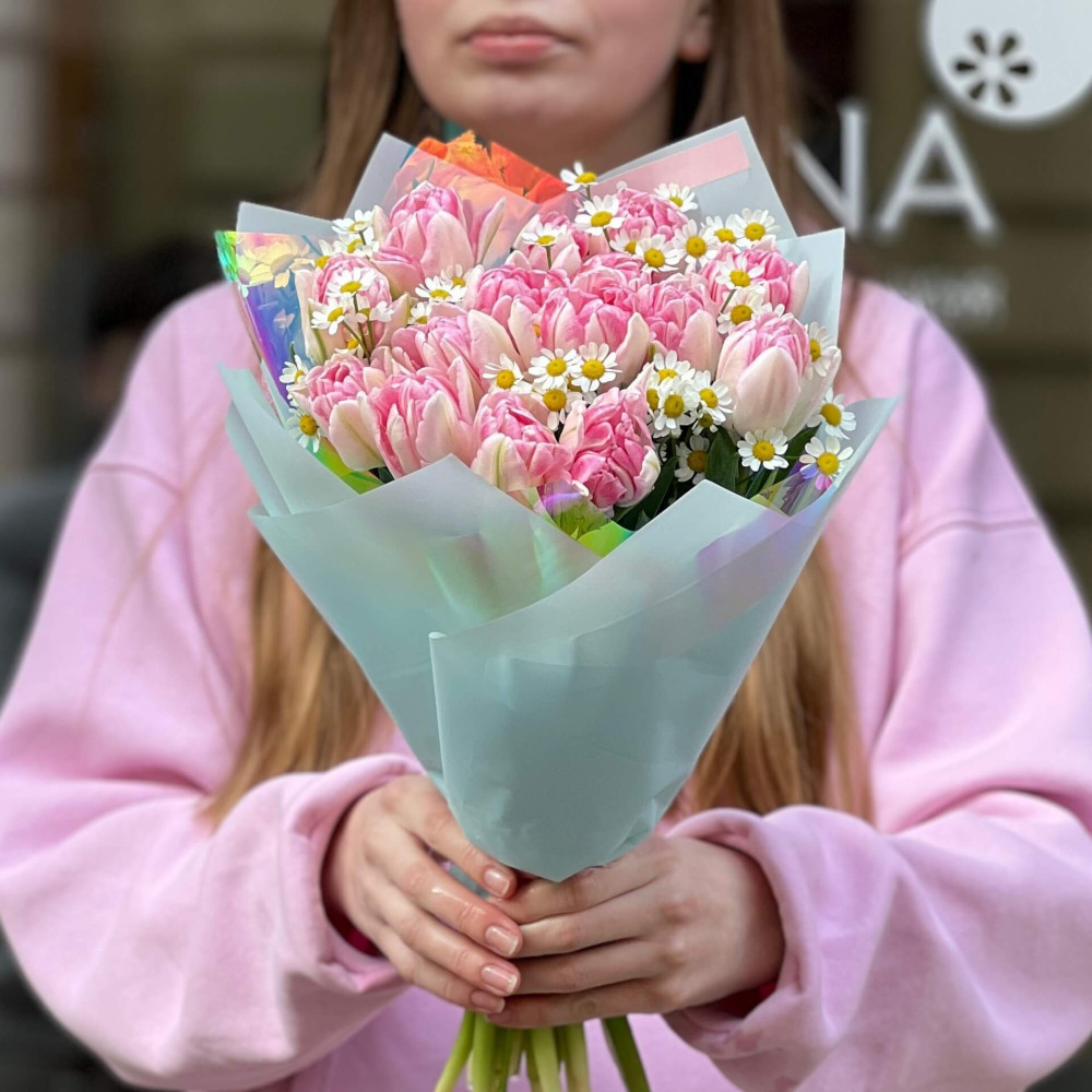 - Як замовити Ніжний букет з ромашками «Рожеві промінчики»? ❯