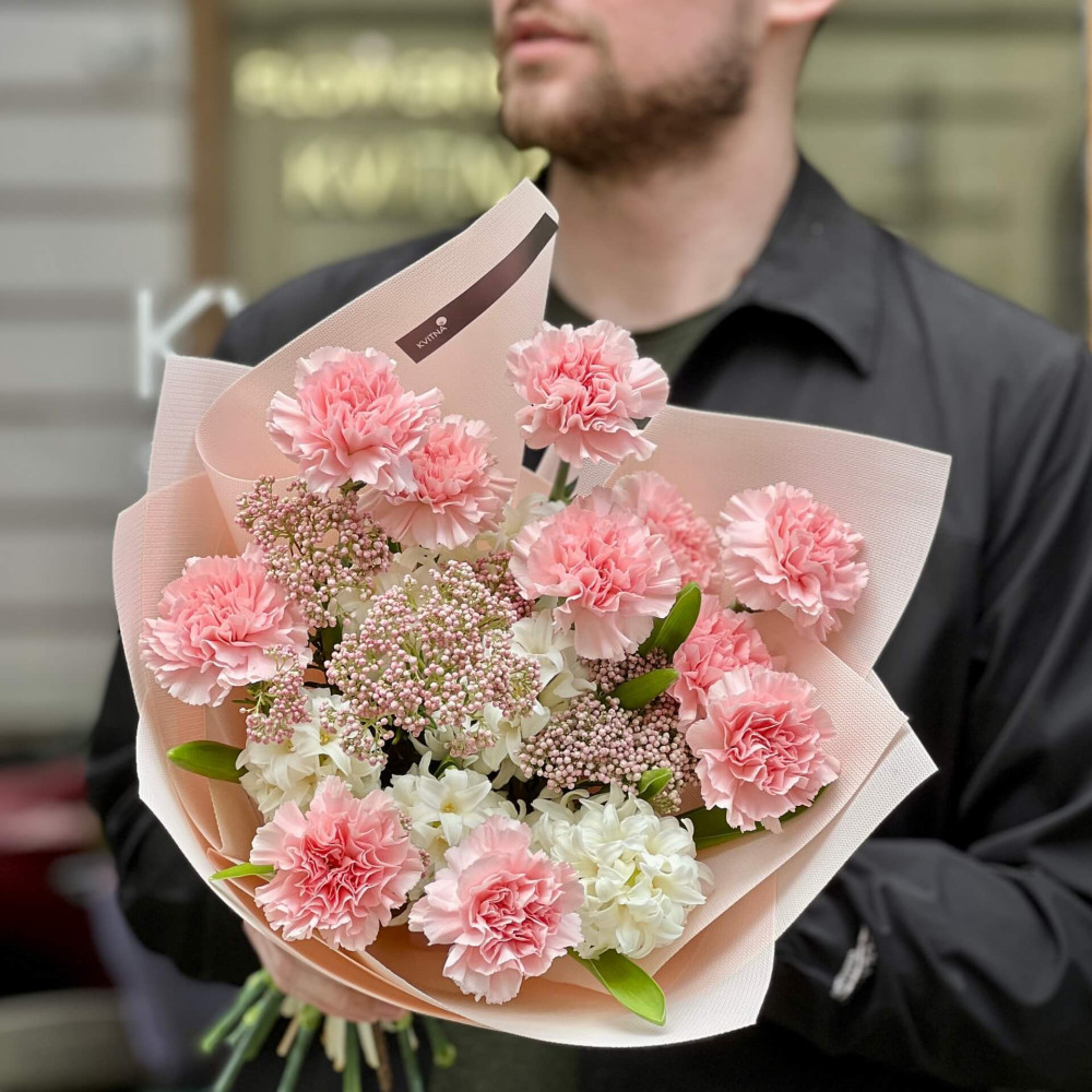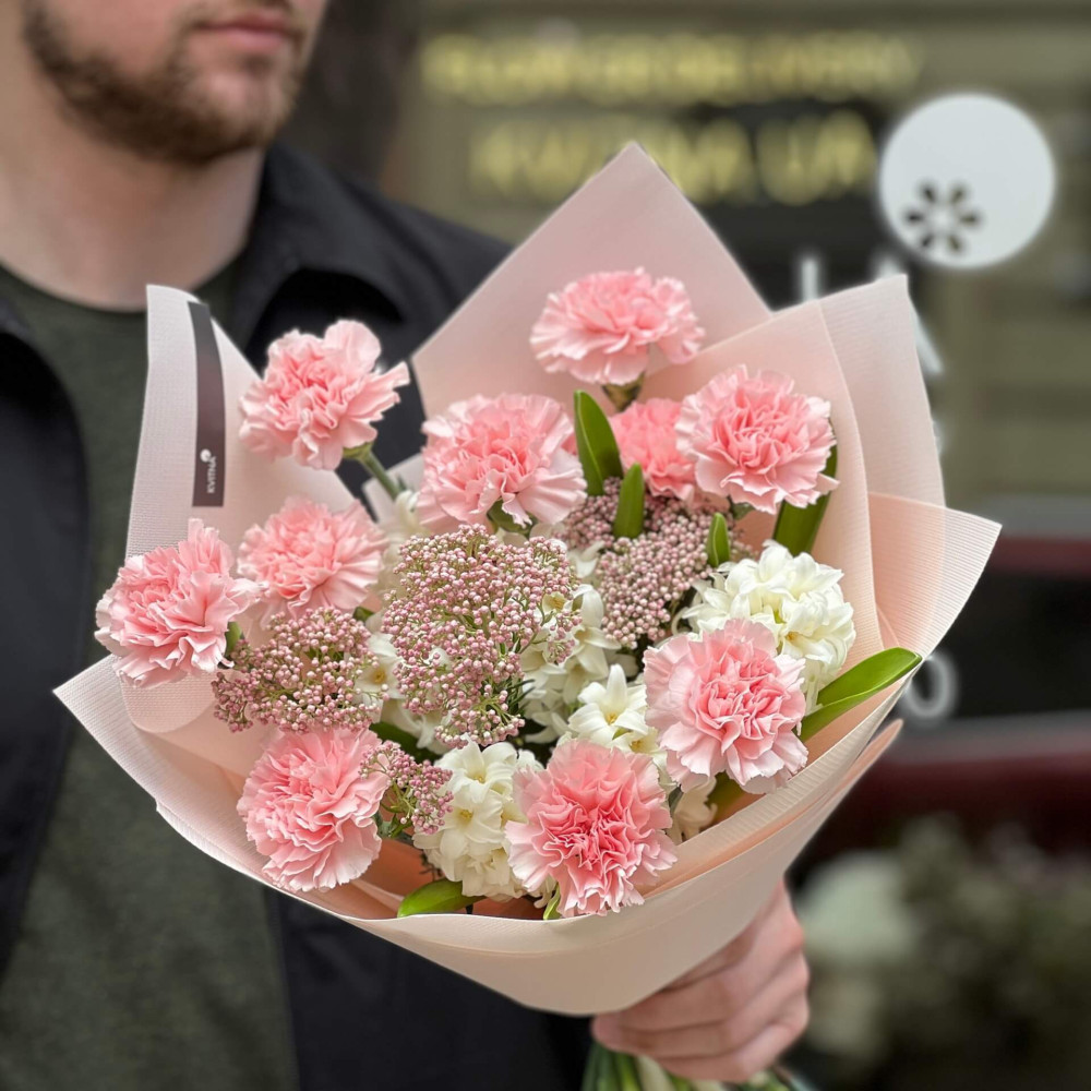 Ароматний букет з білого гіацинту, рожевих діантусів та дрібних перлинок ніжного озотамнусу. Ідея солодкого полуничного десерту, втілена у квітах.