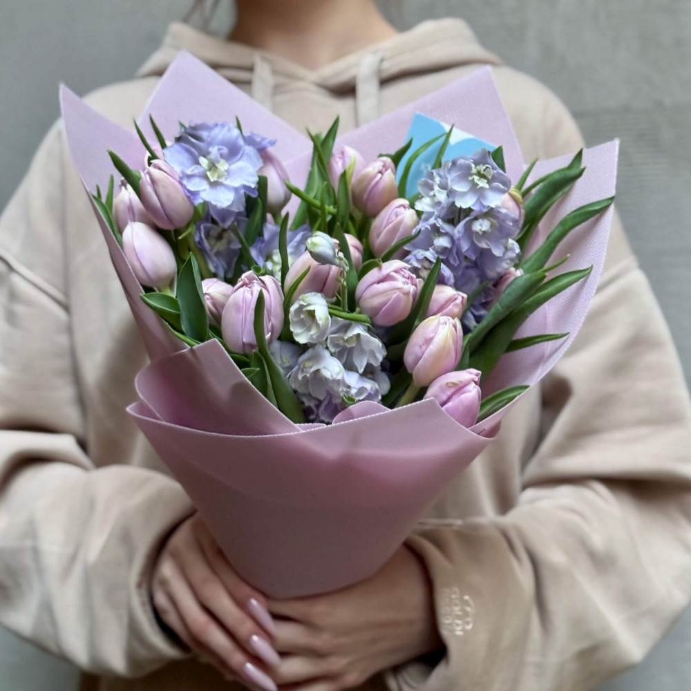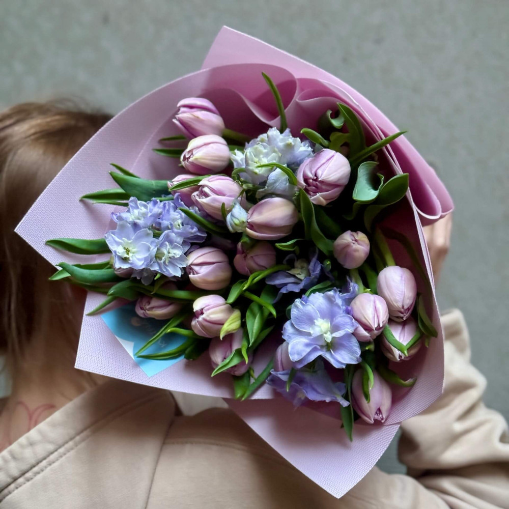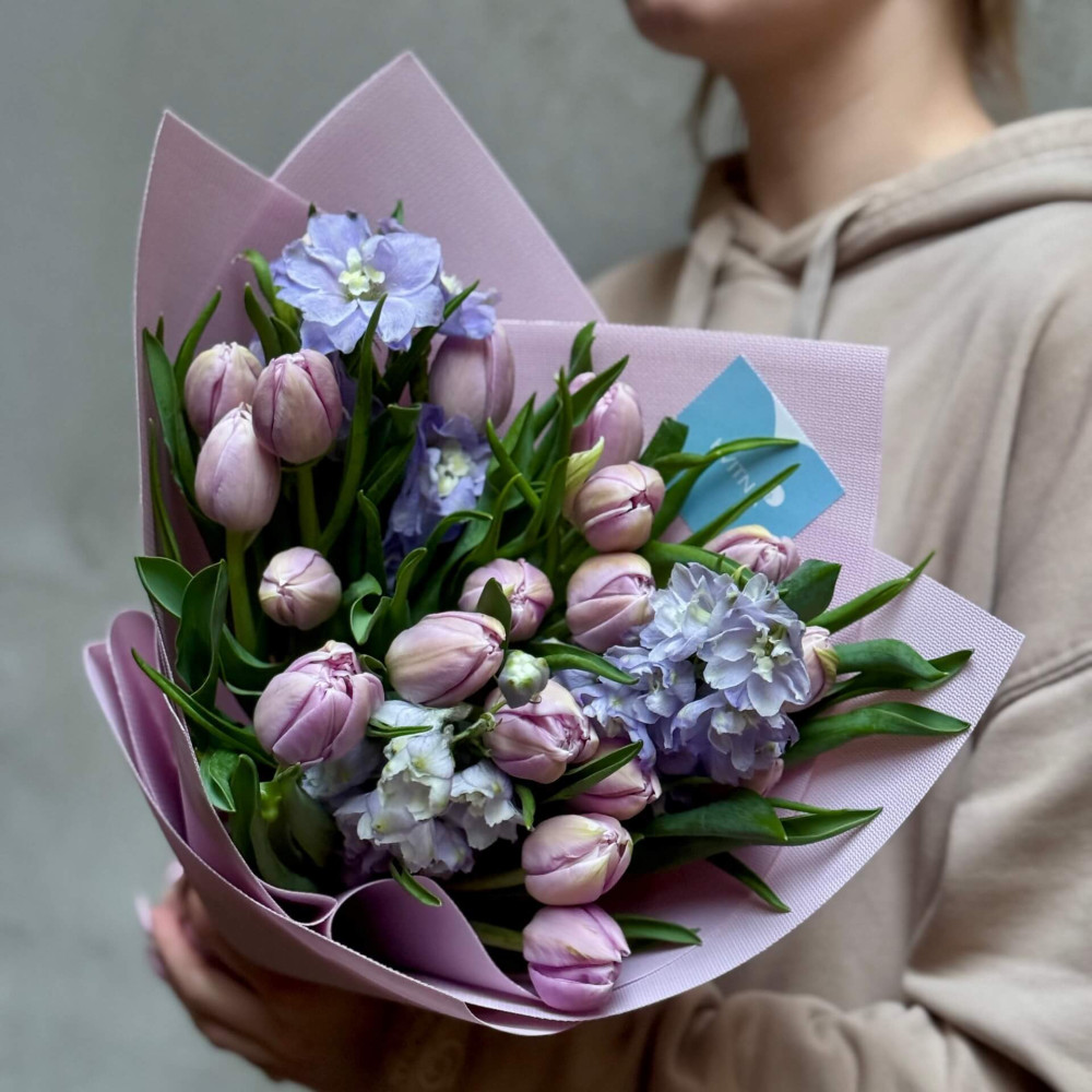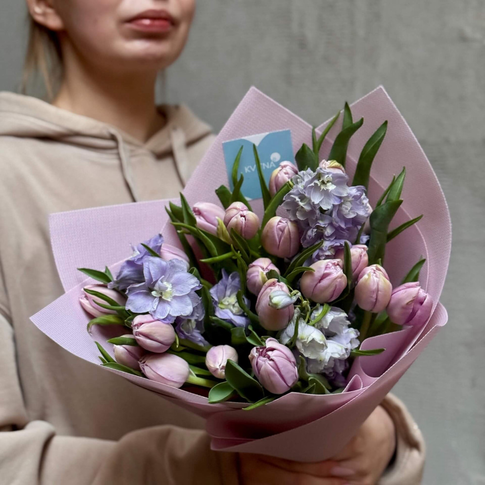 - Як замовити Ніжно-бузковий букет з піоновидними тюльпанами «Мерехтлива мрія»? ❯