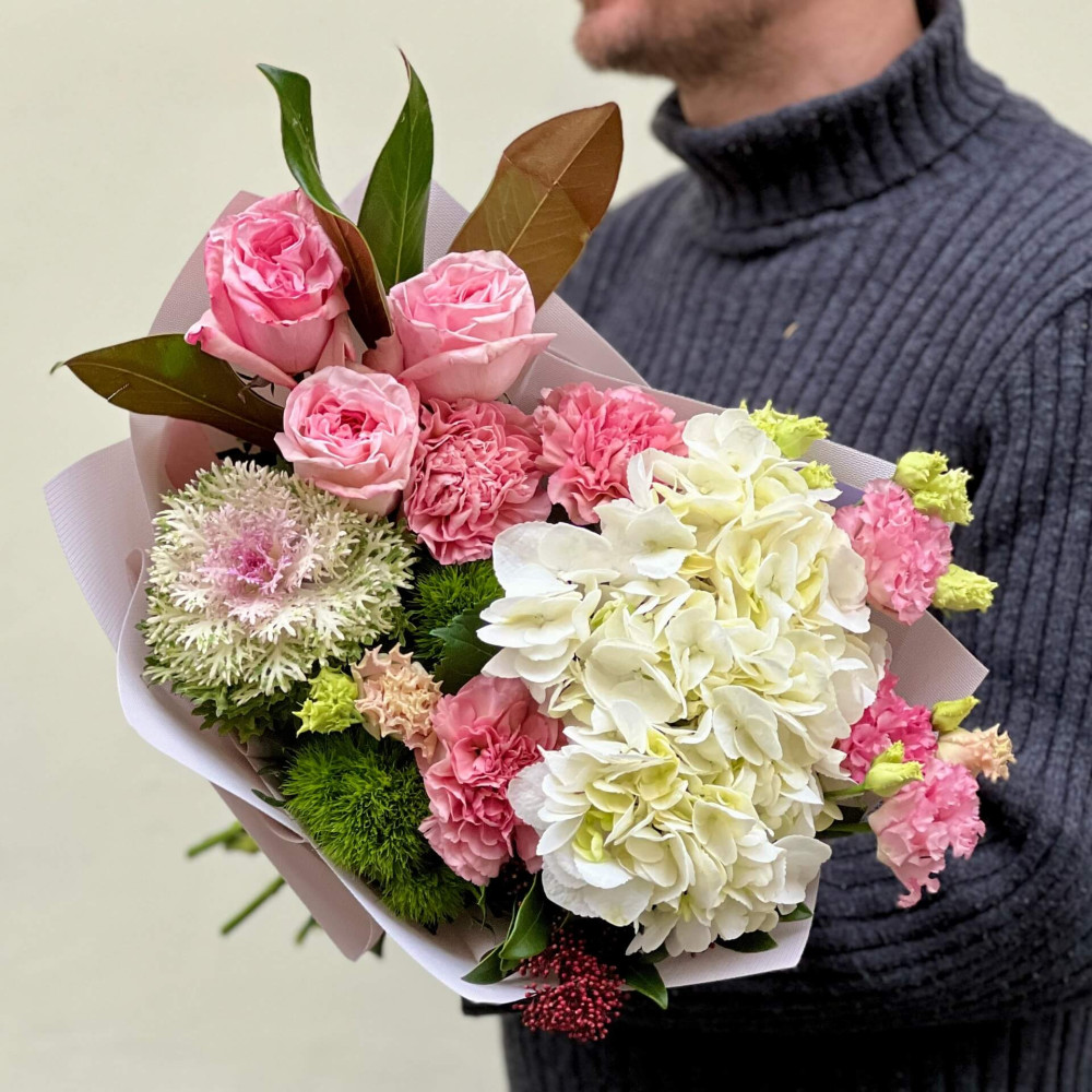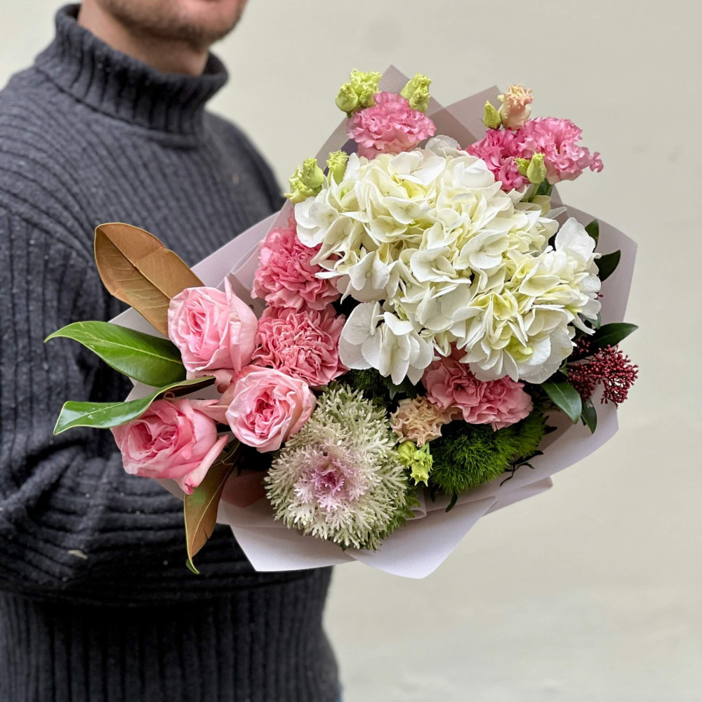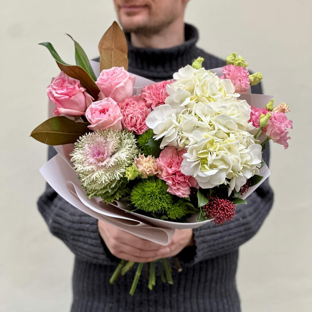 - Як замовити Ніжний букет з гортензією та брасікою «Делікатний сюрприз»? ❯