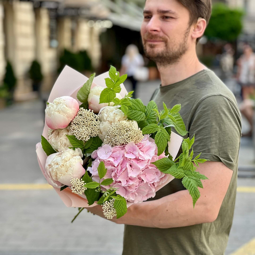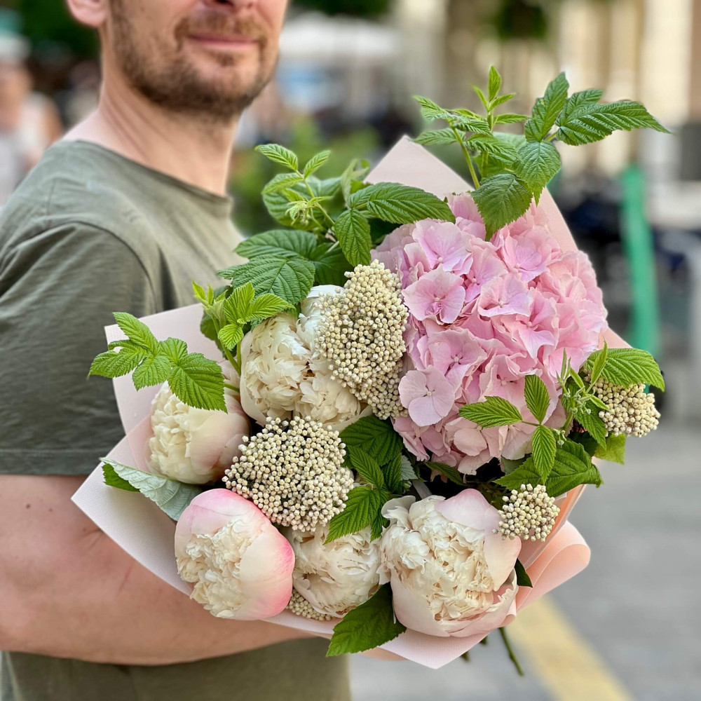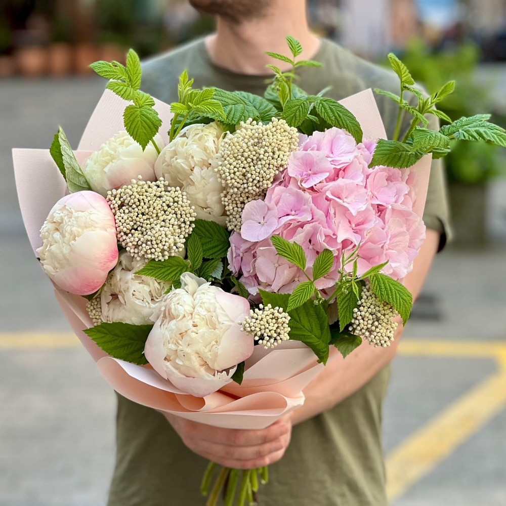 - Як замовити Ніжний букет з півоніями та гортензією «Солоденький вітерець»? ❯