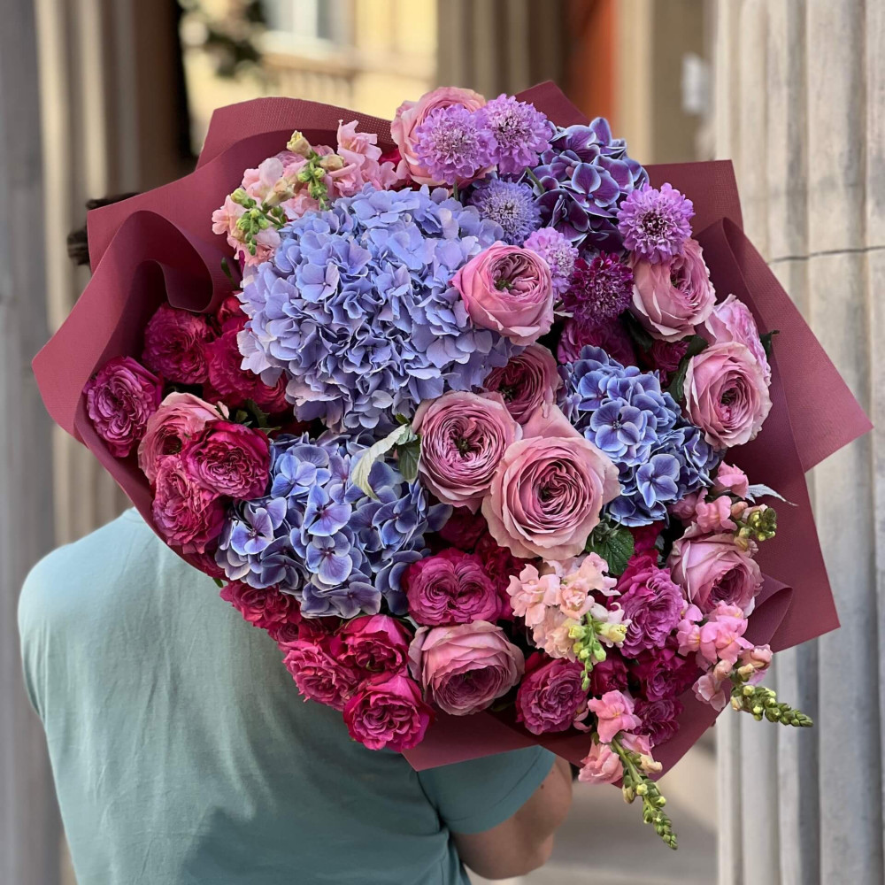 - Як замовити Об’ємний яскравий букет з півонієвидними трояндами Peony Kiss «Амурний вечір»? ❯