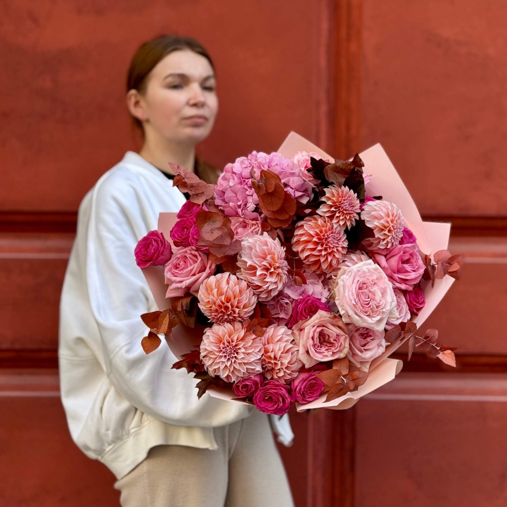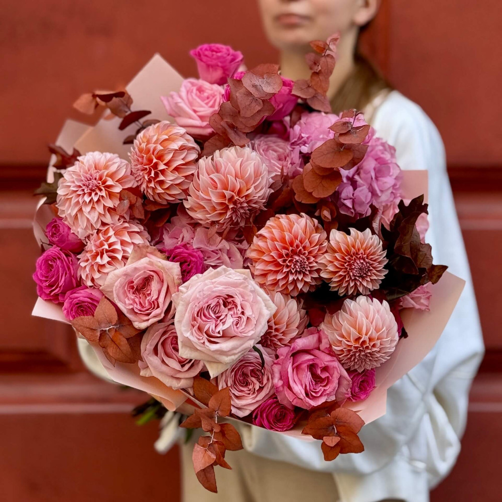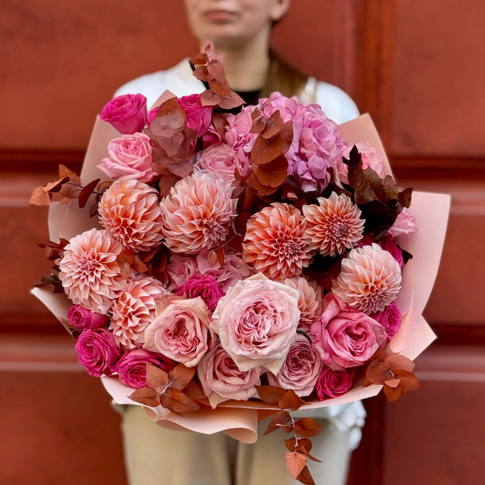 - Як замовити Осінній букет з жоржинами та піоновидними трояндами «Вечірні переливи»? ❯