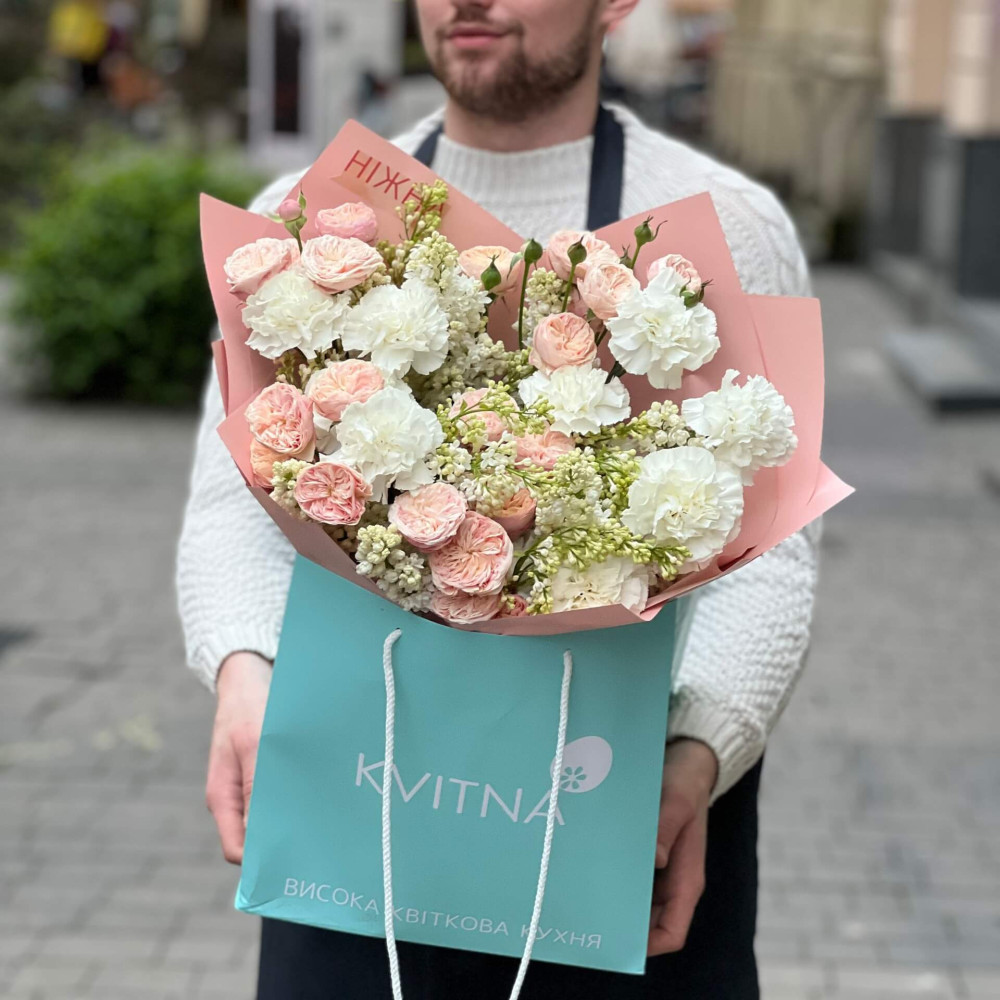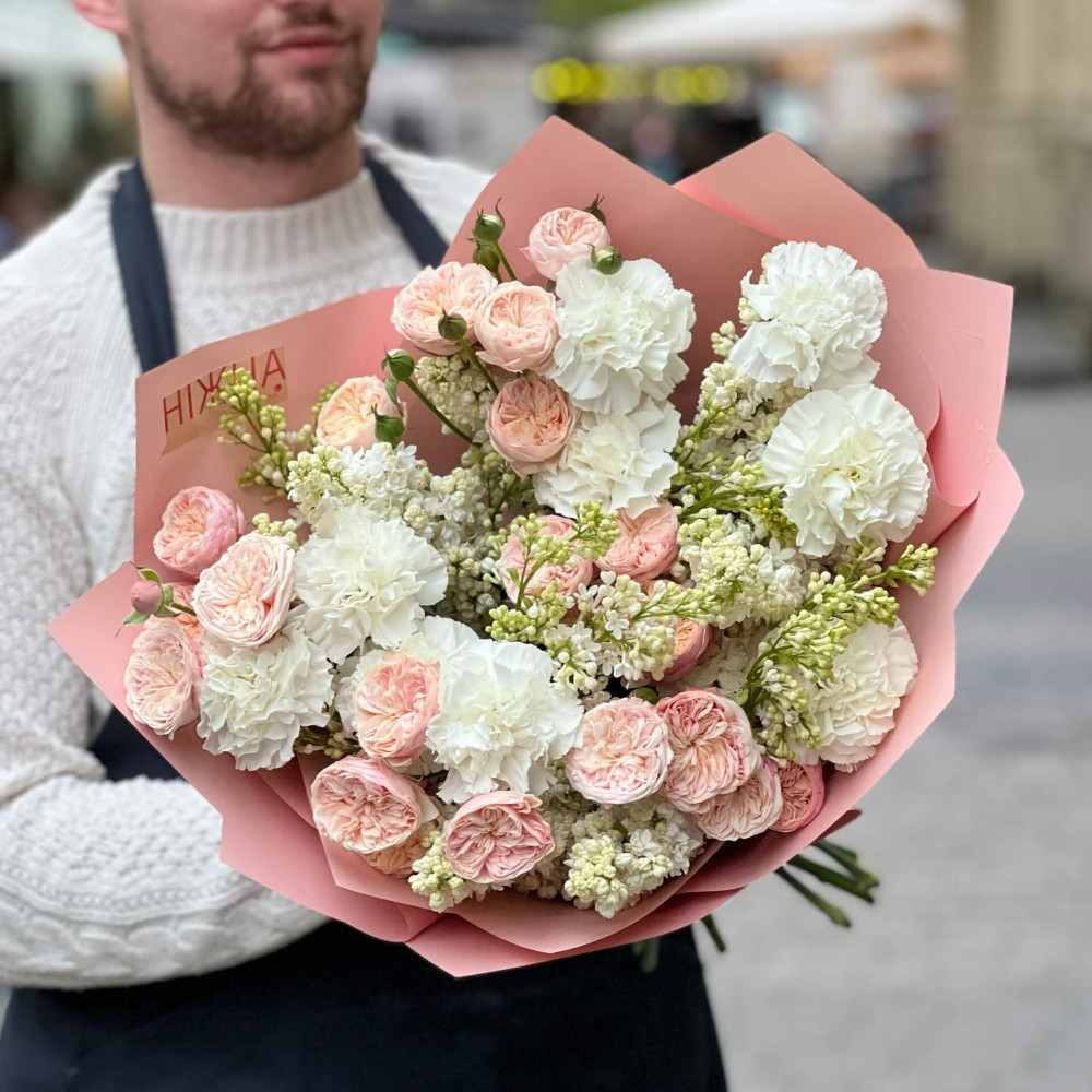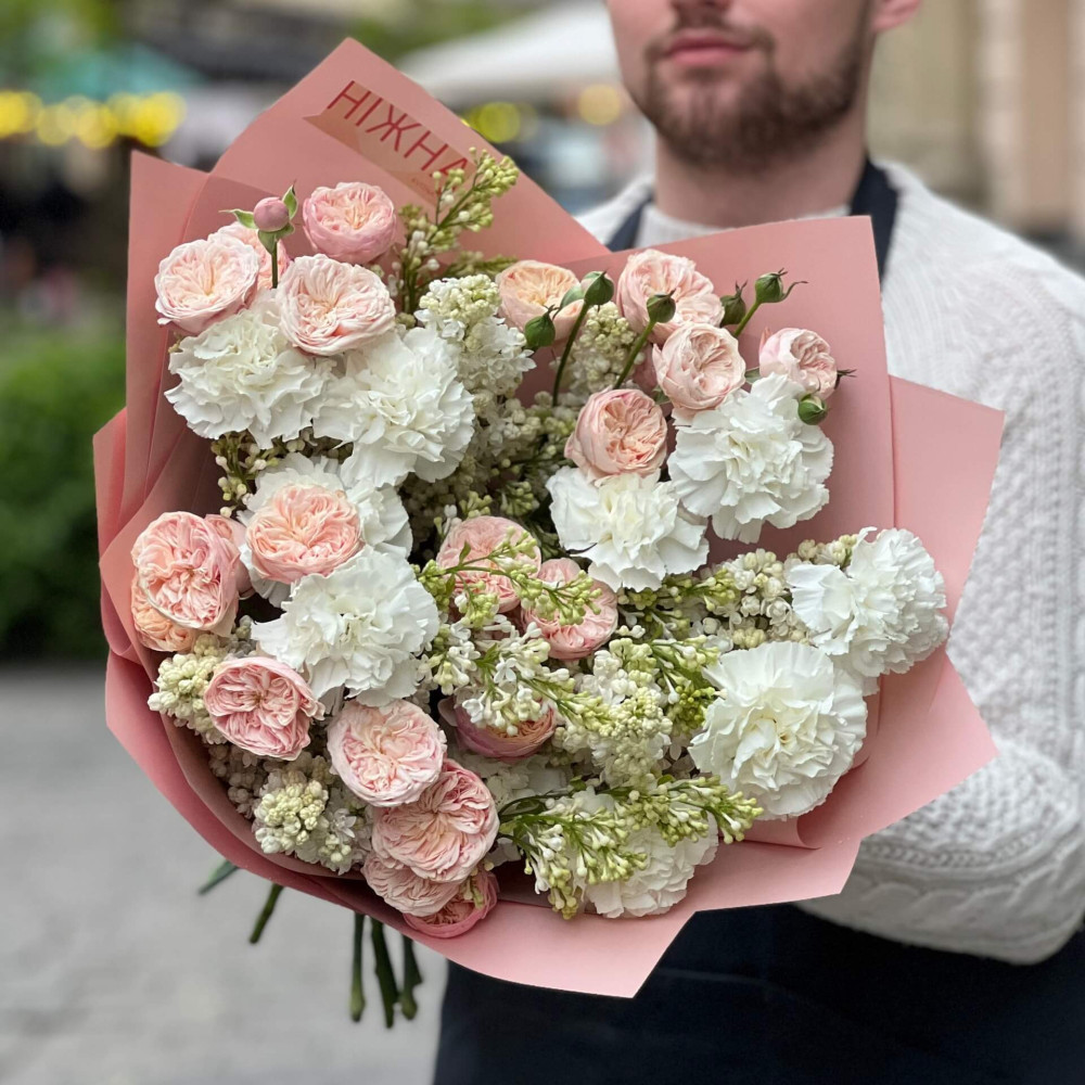 Пастельний персиково-білий мікс - світлий бузок, білий діантус, персикова кущова півонієподібна троянда. розкіш ніжних відтінків та вишуканих квітів.