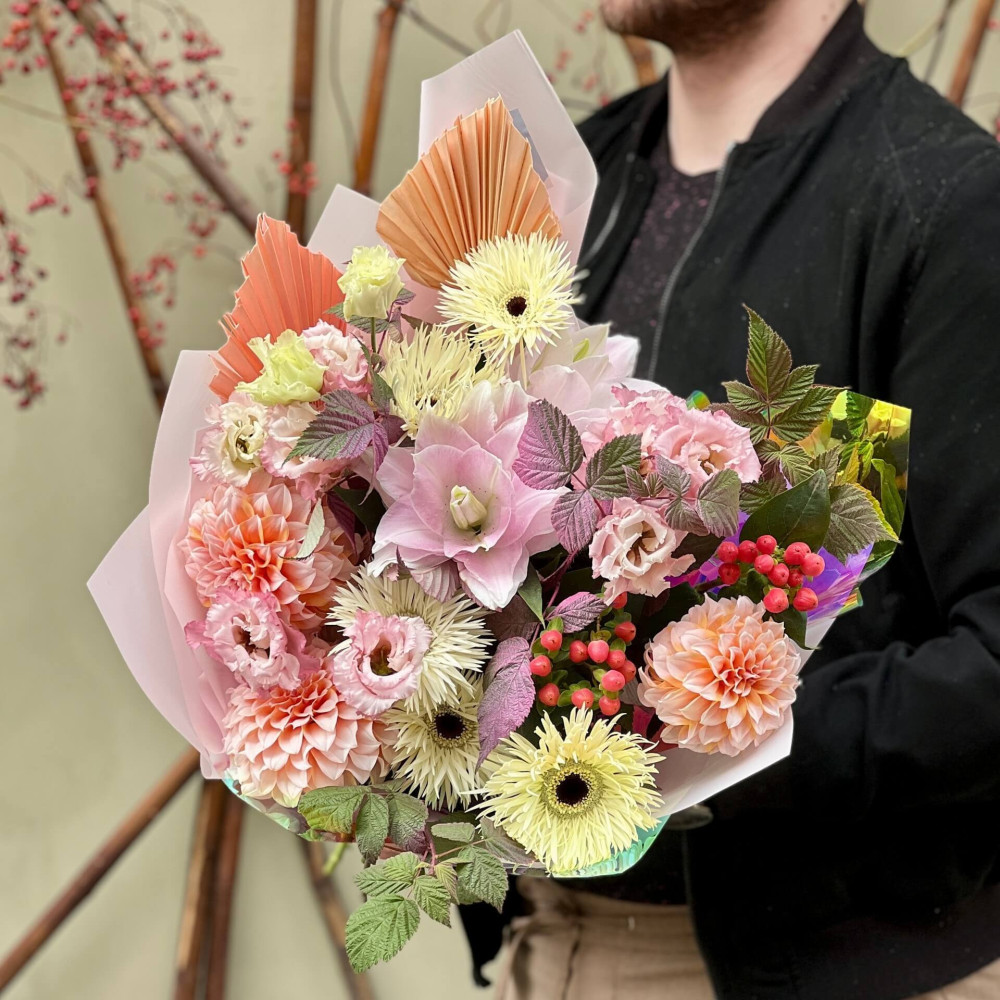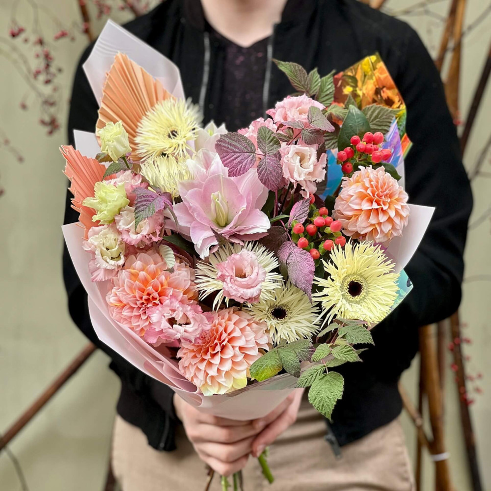 Квіти: Гербера, Жоржина, Еустома, Малина (листя), Хіперикум, Лілія, Пальма