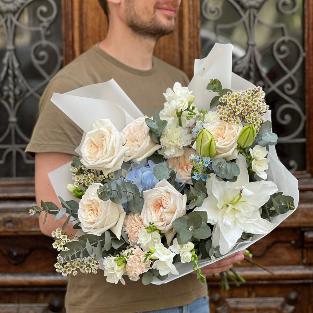 Квіти: Оксіпеталум, Гортензія, Фрезія, Лілія, Евкаліпт, Хамелаціум, Троянда піоновидна, Діантус (Гвоздика)