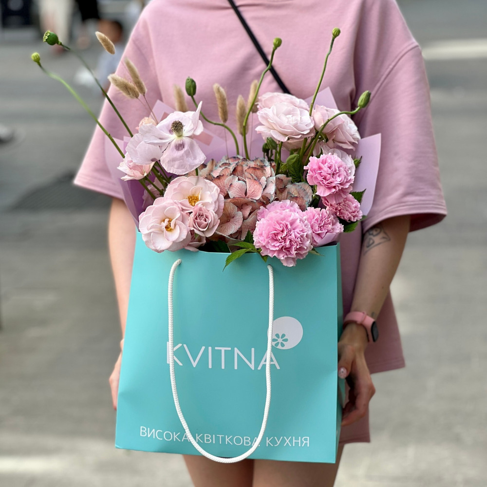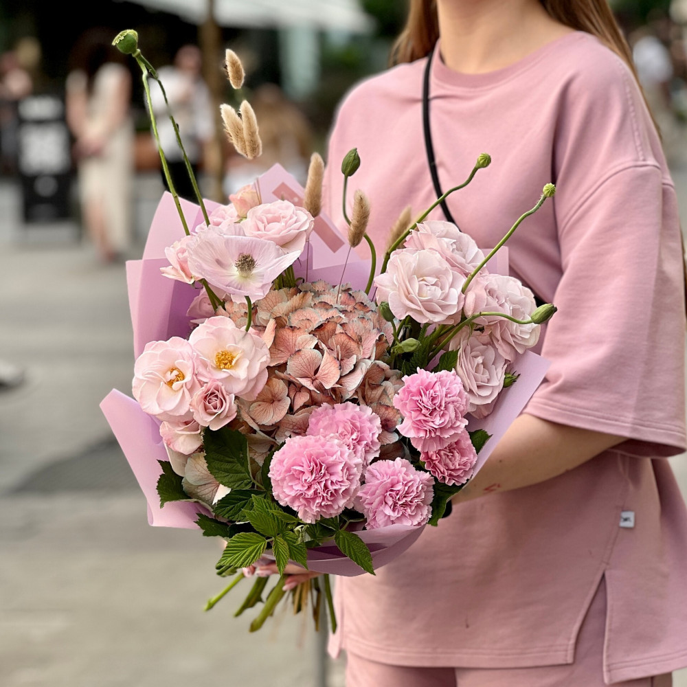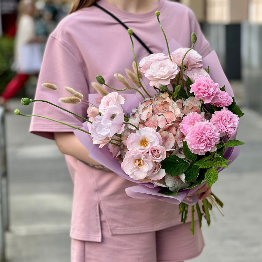 Квіти: Гортензія, Лагурус, Папавер (Мак), Троянда піоновидна кущова, Діантус (Гвоздика)