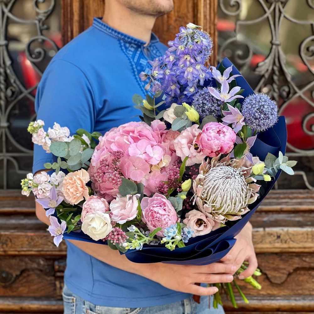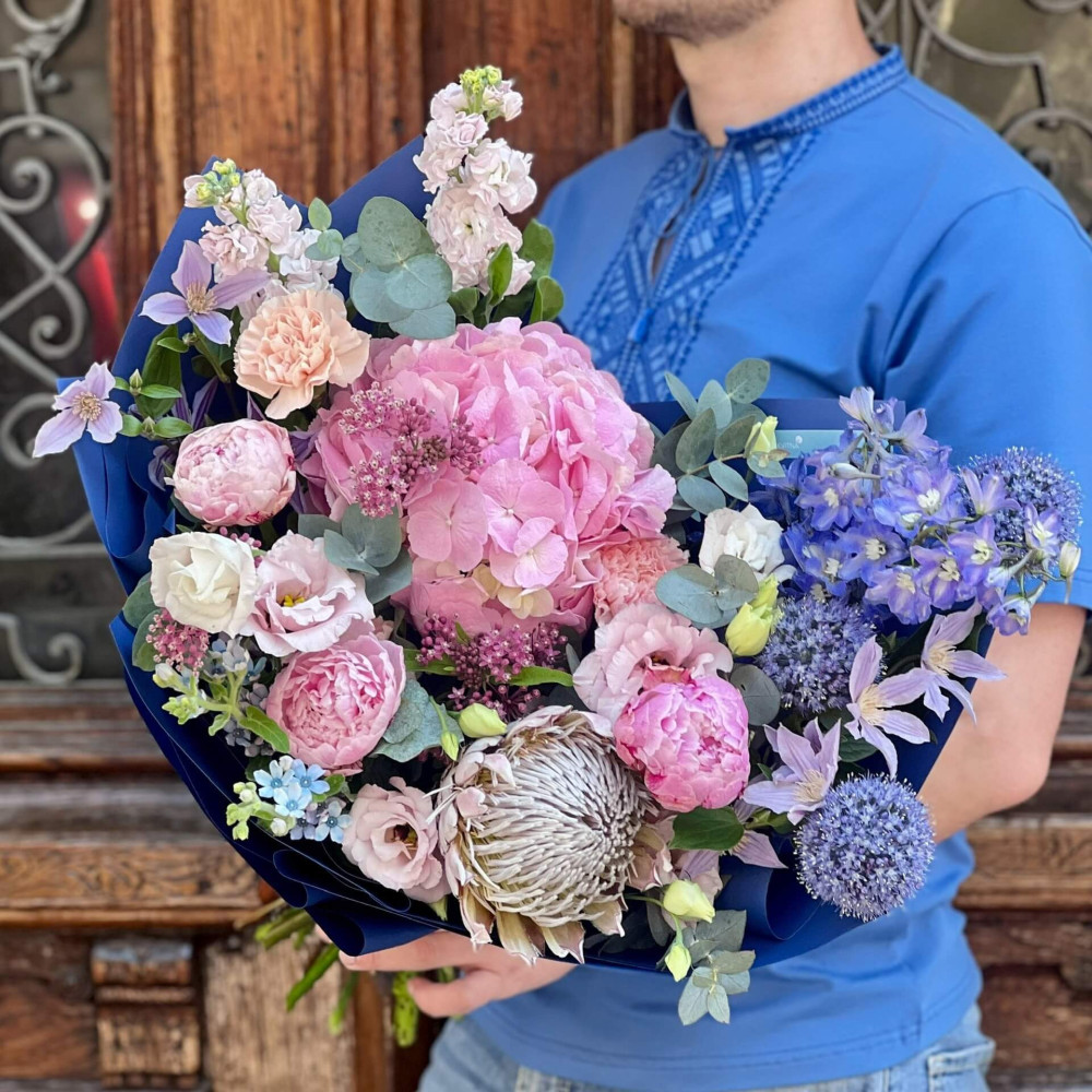 - Як замовити Пастельний букет з гортензією та протеєю «Червневий сад»? ❯