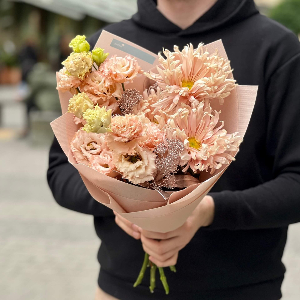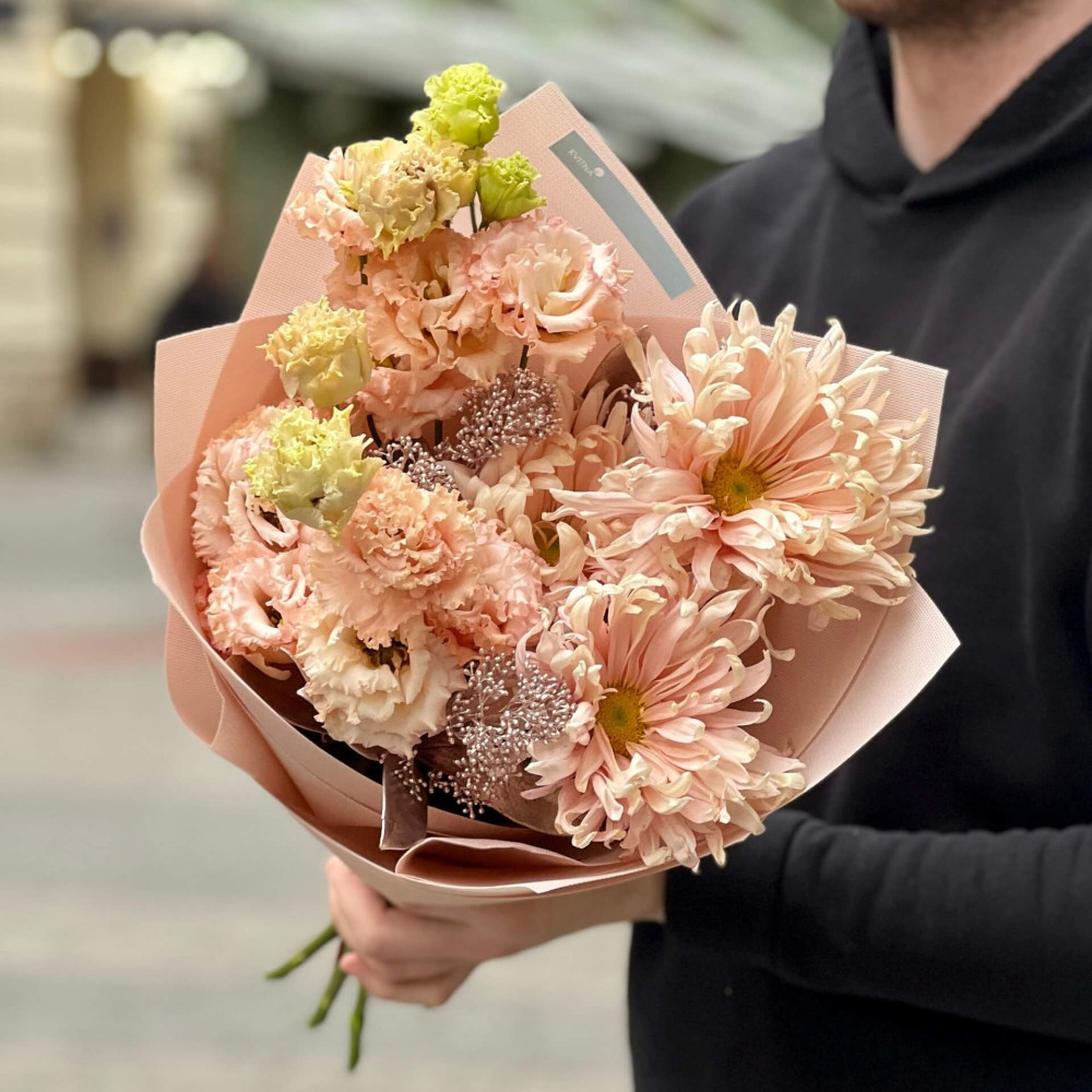 - Як замовити Персиковий букет з хризантемою Avignon «Тепле золото»? ❯