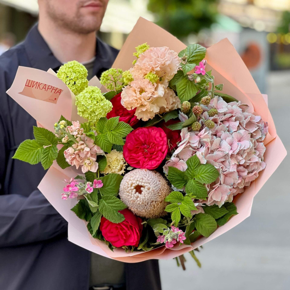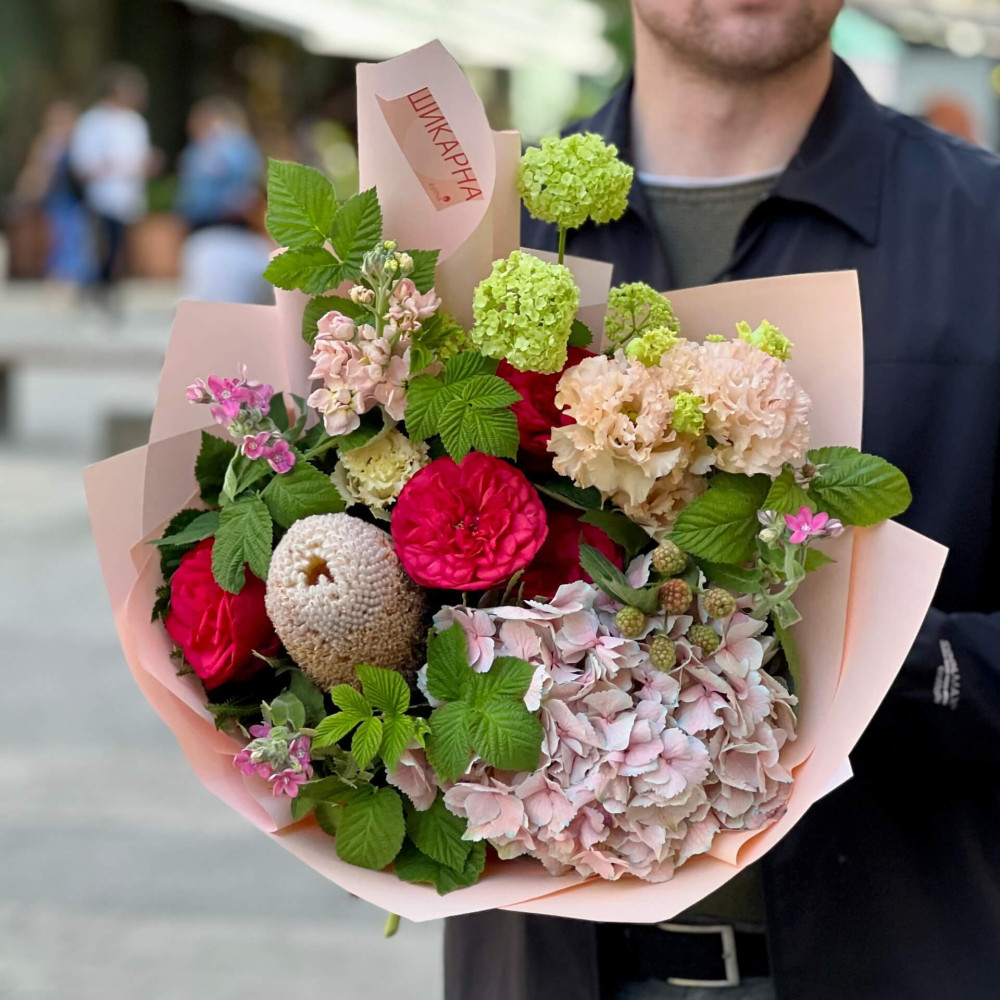 Квіти: Еустома, Гортензія, Вібурнум, Оксіпеталум, Рубус, Матіола, Троянда піоновидна, Банксія, Малина (листя)