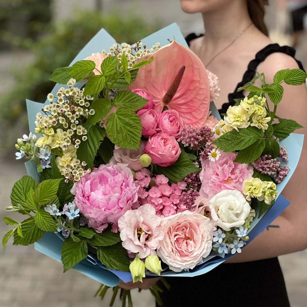 Квіти: Хамелаціум, Матіола, Півонія, Оксіпеталум, Еустома, Троянда піоновидна кущова, Троянда, Гортензія, Малина (листя), Асклепія, Антуріум