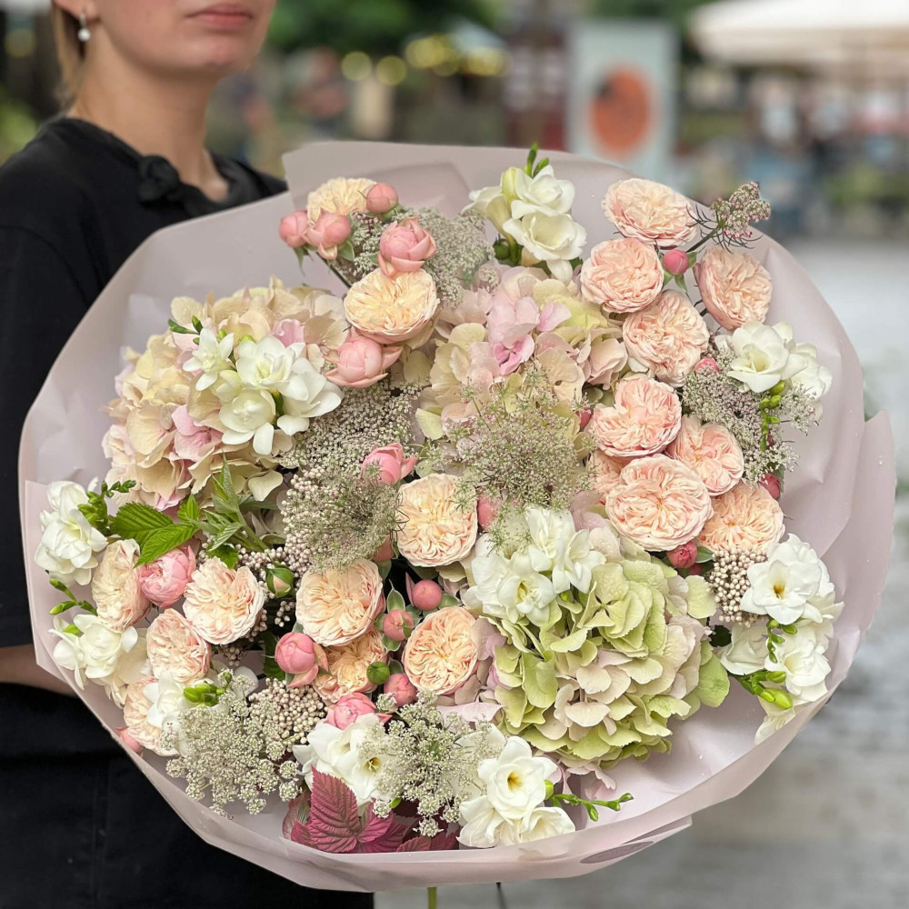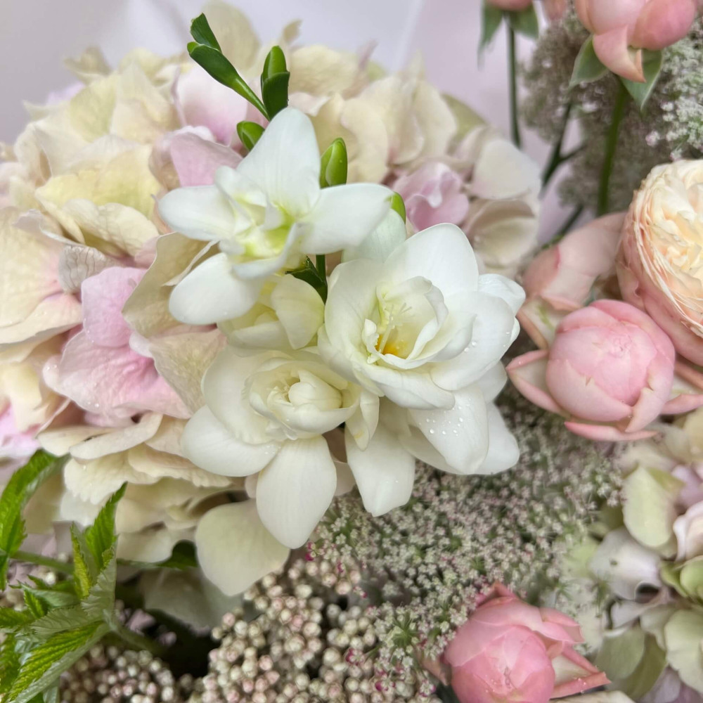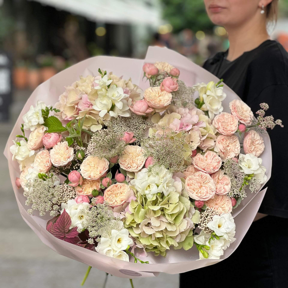 Квіти: Троянда піоновидна кущова, Фрезія, Озотамнус, Гортензія, Аммі