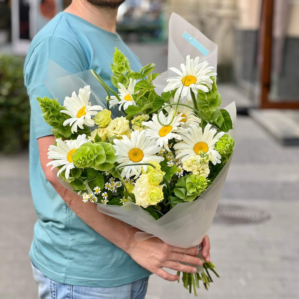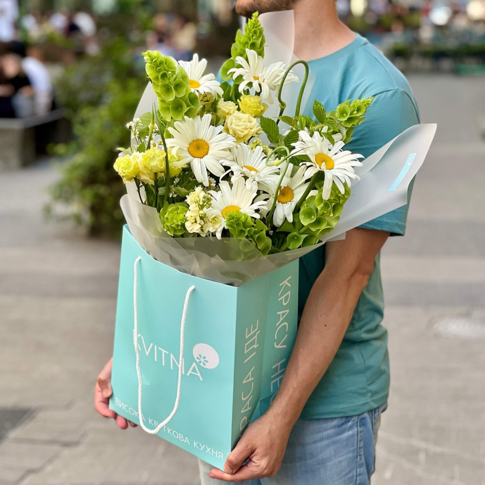 Квіти: Танацетум, Малина (листя), Молюцела, Алліум, Матіола, Еустома