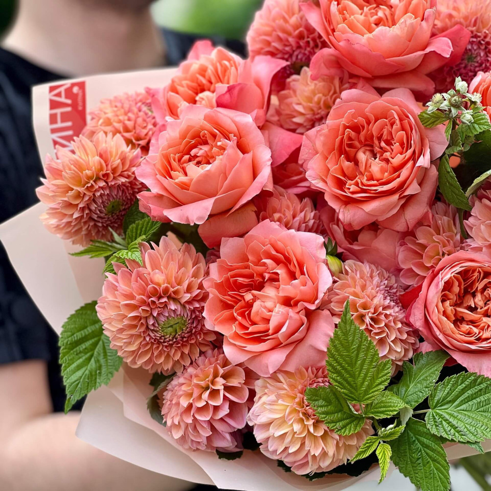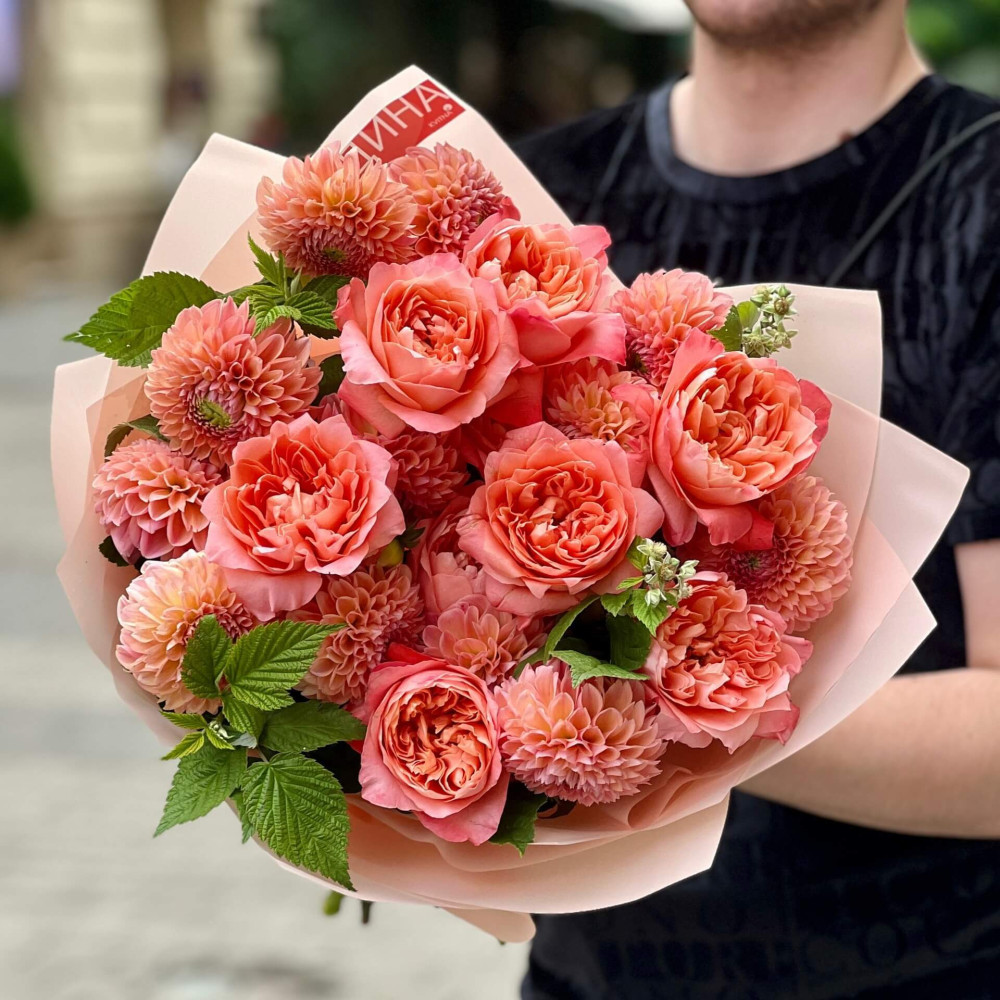 Квіти: Троянда піоновидна, Малина (листя), Жоржина