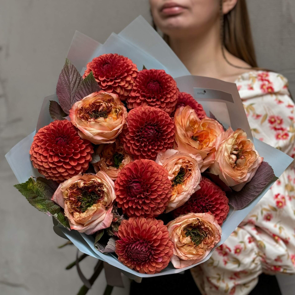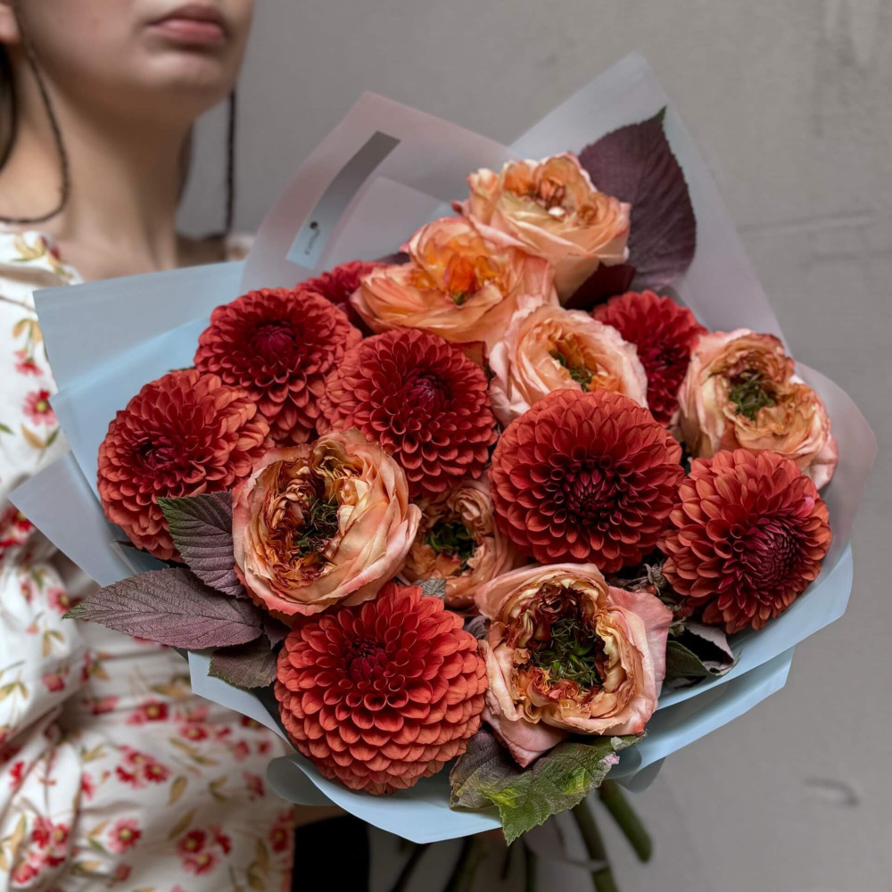 Квіти: Малина (листя), Жоржина Brown Sugar, Троянда піоновидна Melon X-Pression