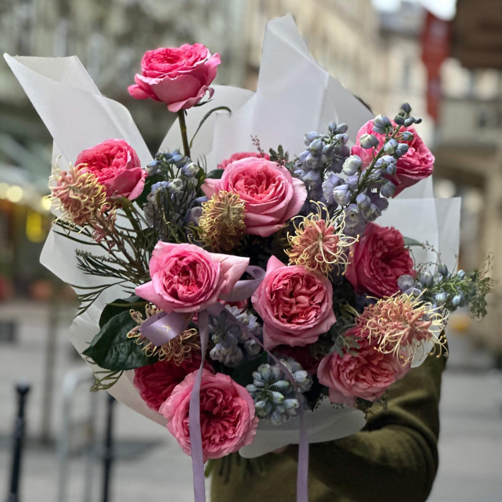 - Як замовити Повітряний яскравий букет з трояндами, дельфініумом та гревілеєю «Квітковий феєрверк»? ❯
