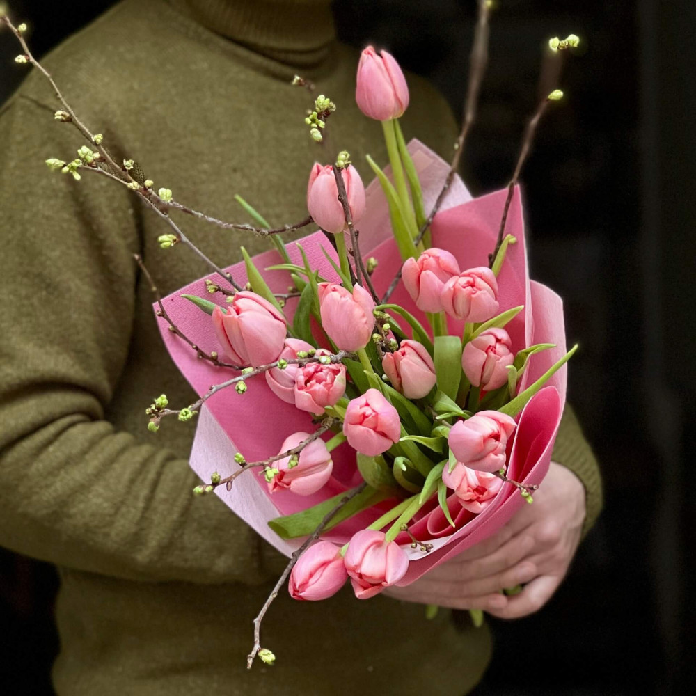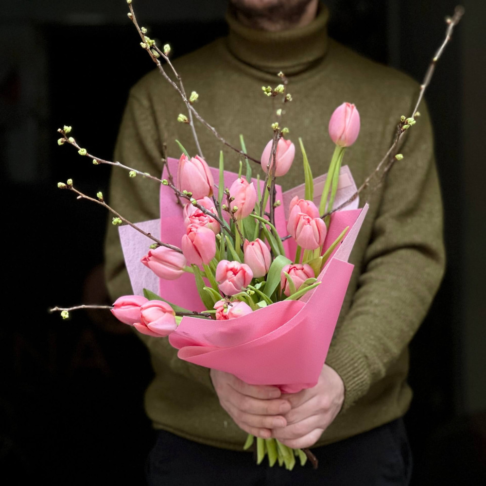 - Як замовити Преміальні тюльпани Salmon у сезонному букеті з гілочками «Весняна прозорість»? ❯