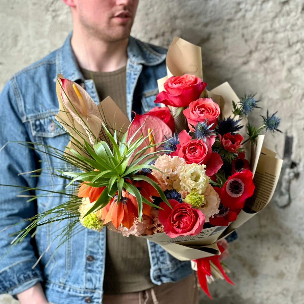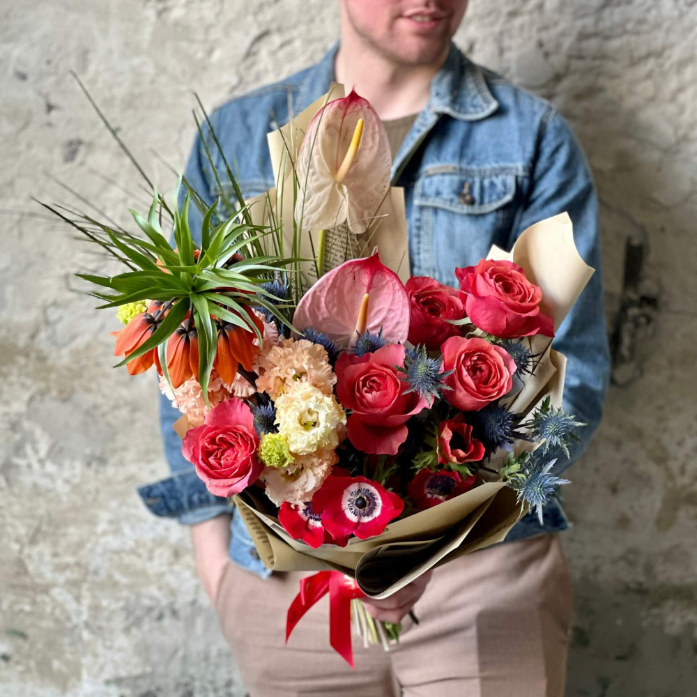 Квітами найлегше повідомити те, що не наважуєшся сказати словами. Коралові троянди, персикова еустома, яскраво-червона анемона, кобальтово-синій ерінгіум, велична фрітілярія з короною квітів та рожевий антуріум, схожий на серденько розкажуть отримувачці все самі :)