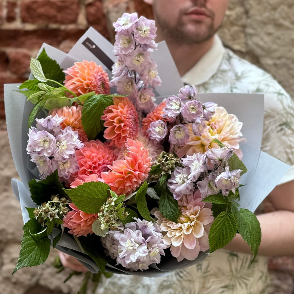 Квіти: Жоржина, Дельфініум, Малина (листя)