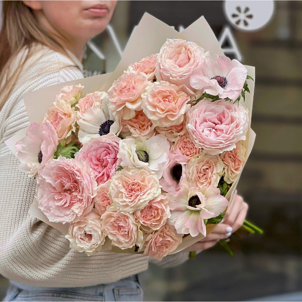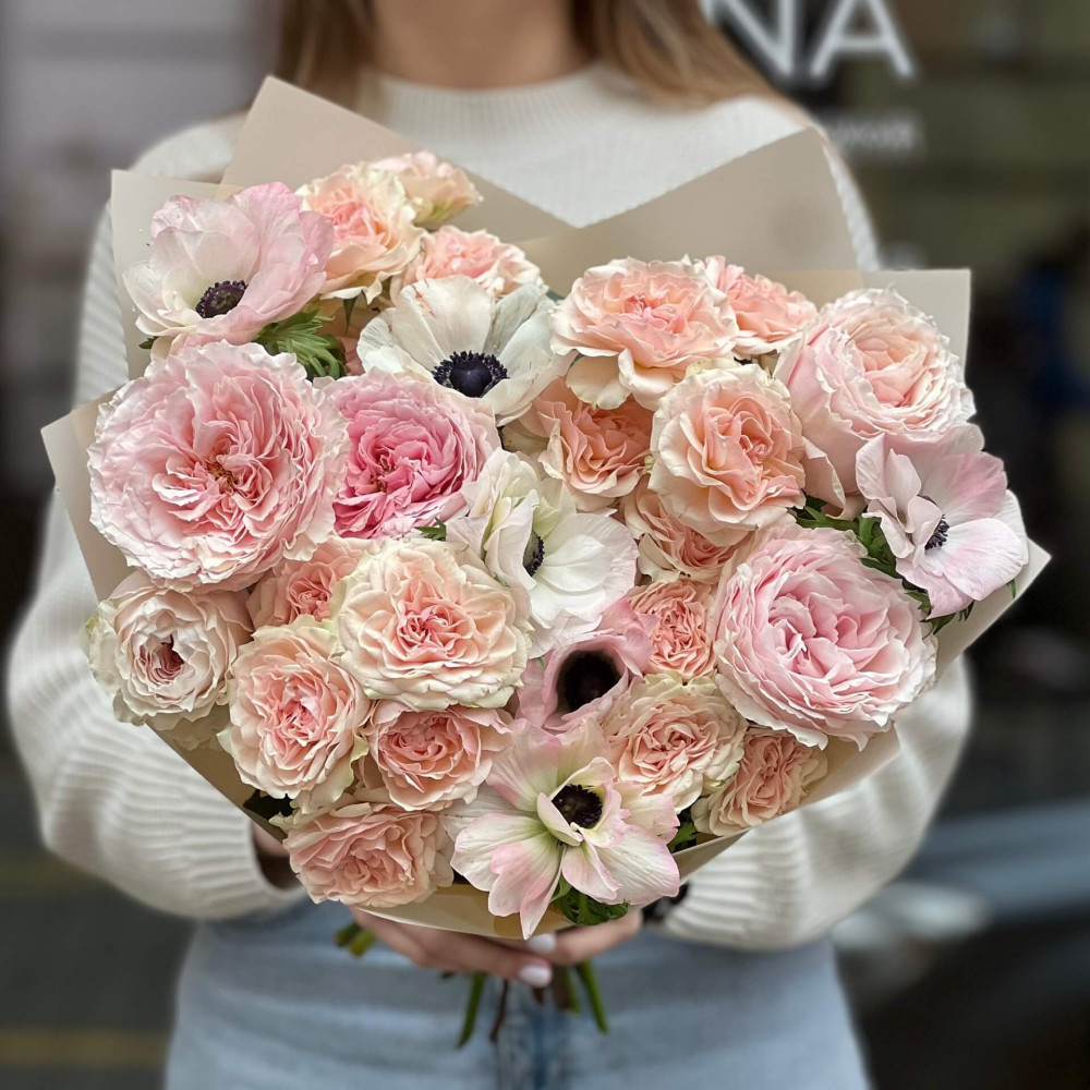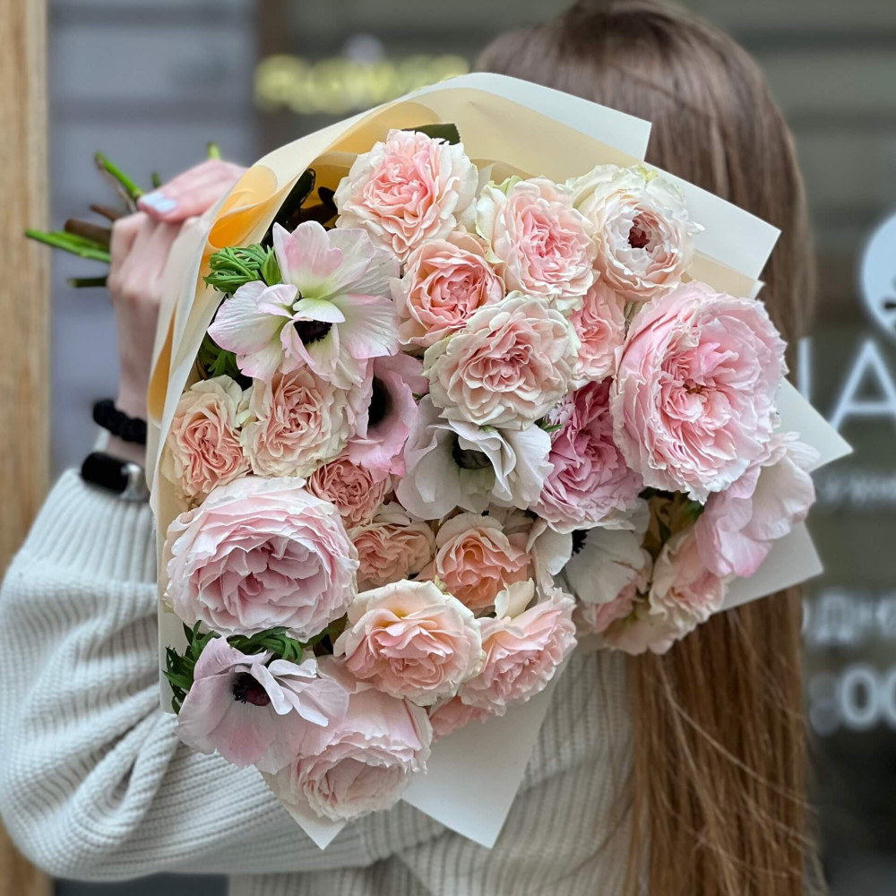 Квіти: Троянда піоновидна кущова, Троянда піоновидна Tsumugi, Анемон