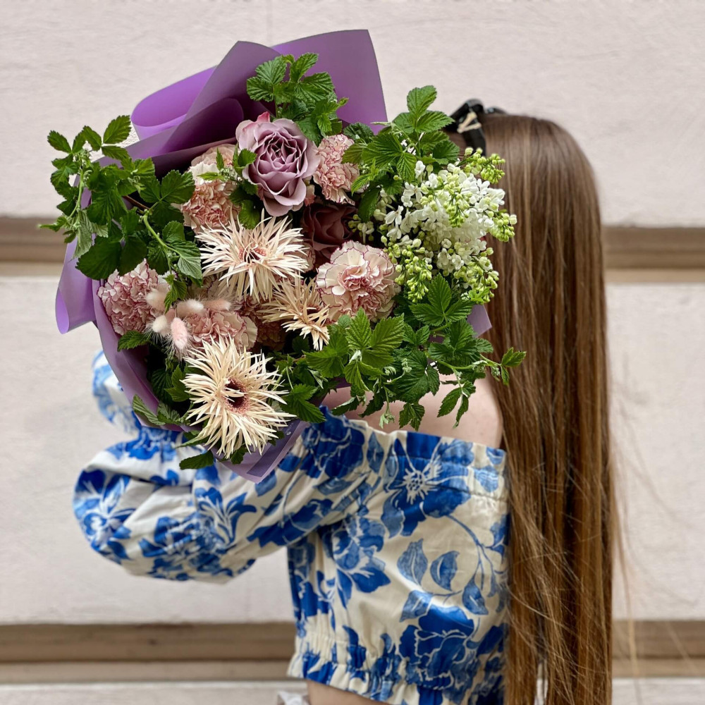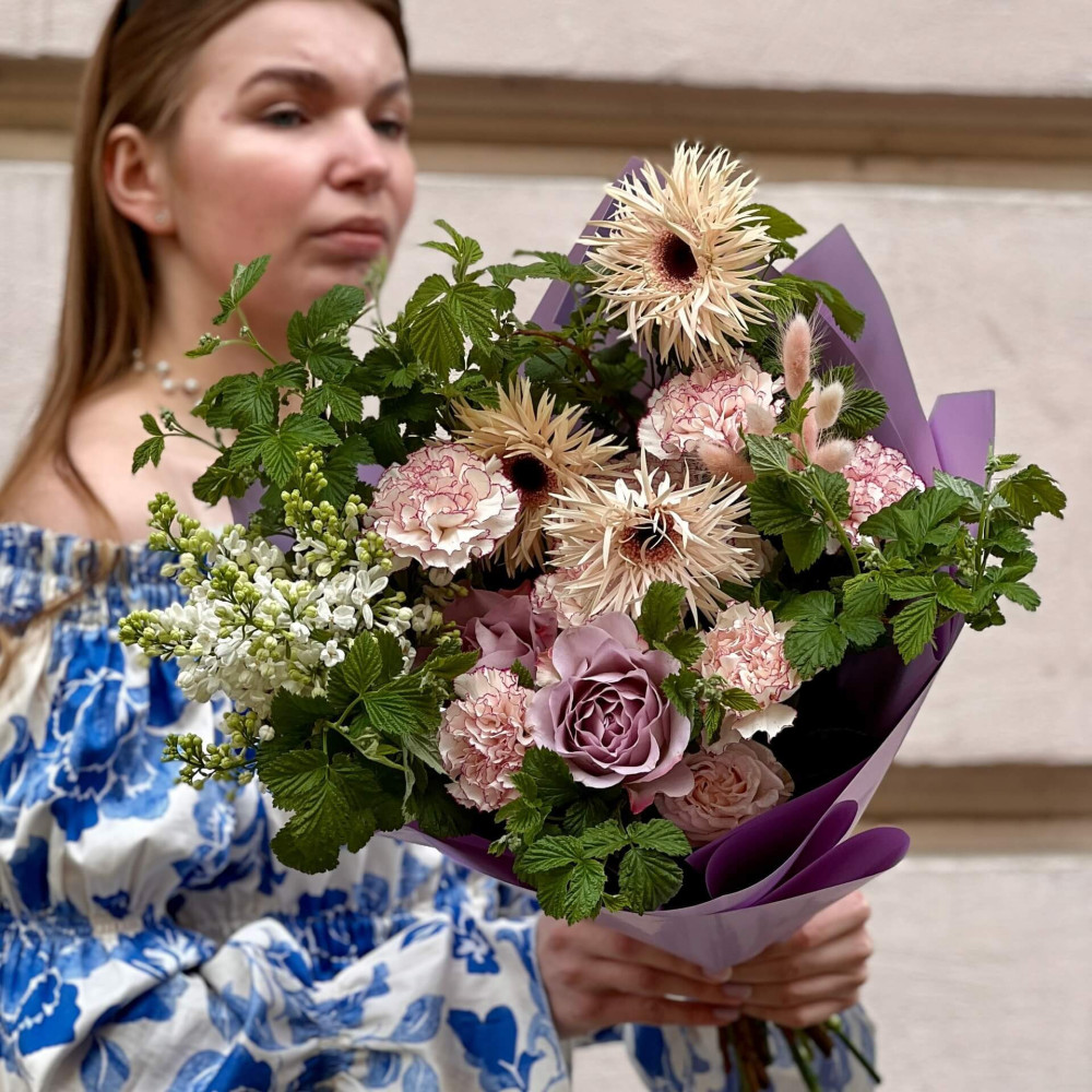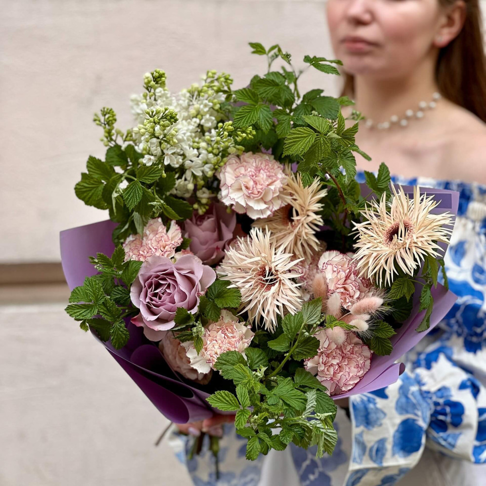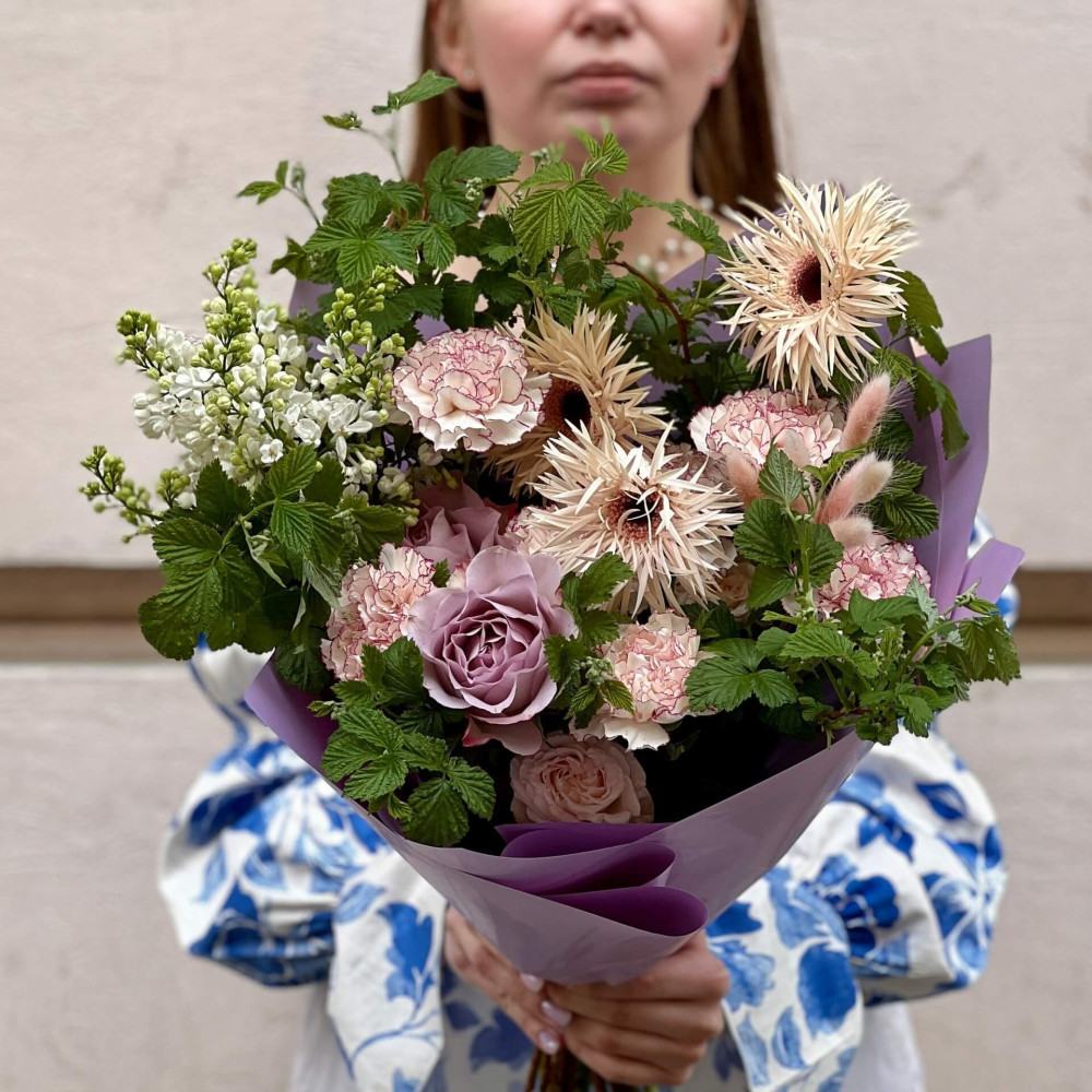 Квіти: Бузок, Гербера, Малина (листя), Троянда піоновидна кущова, Діантус (Гвоздика), Лагурус, Троянда