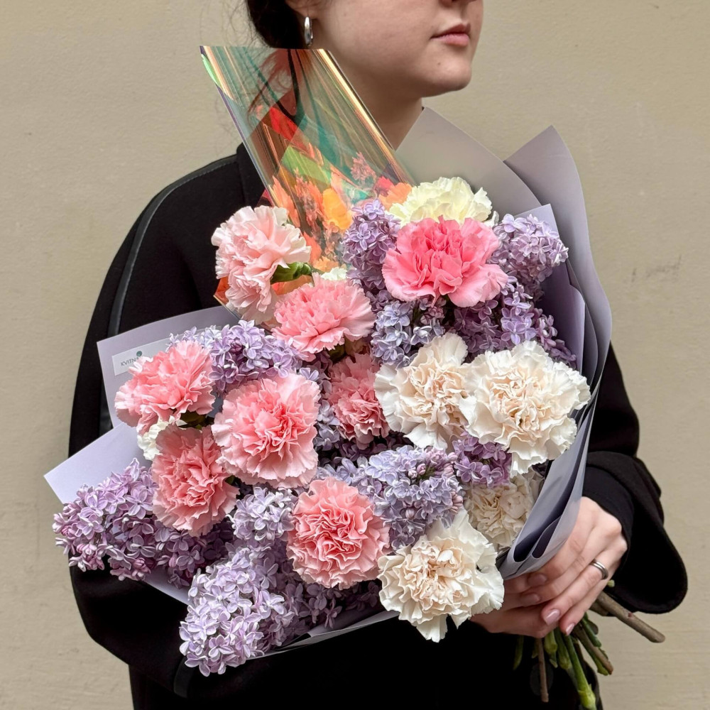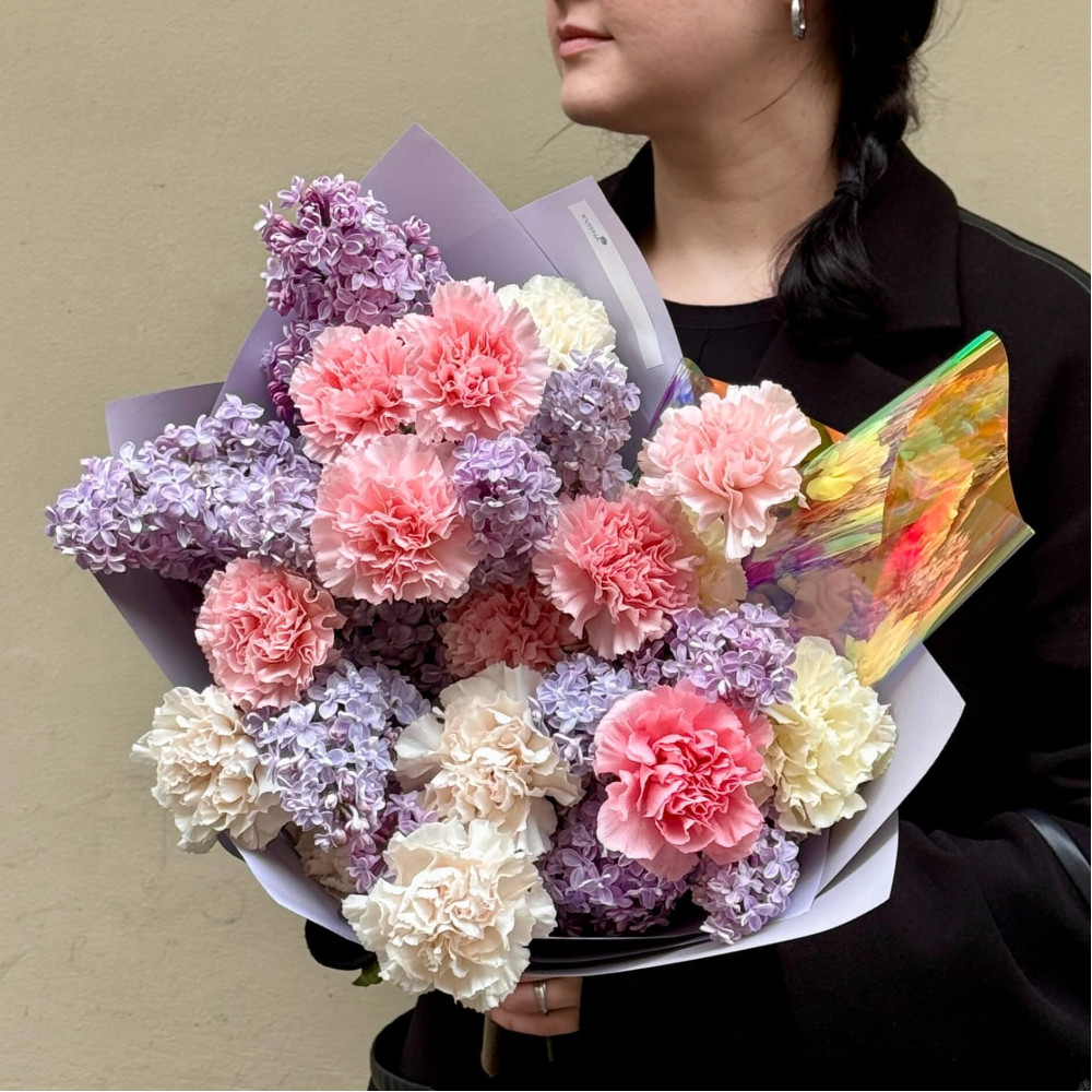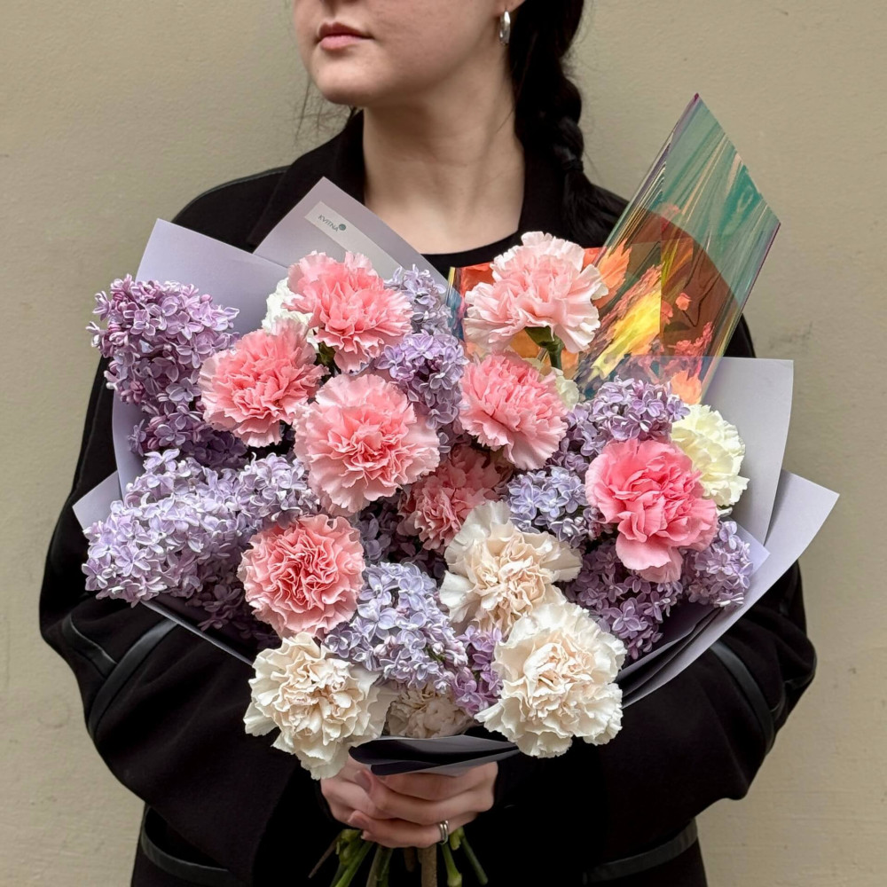 - Як замовити Пухнастий ніжний букет із діантусів та сезонного бузку «Світанковий флер»? ❯