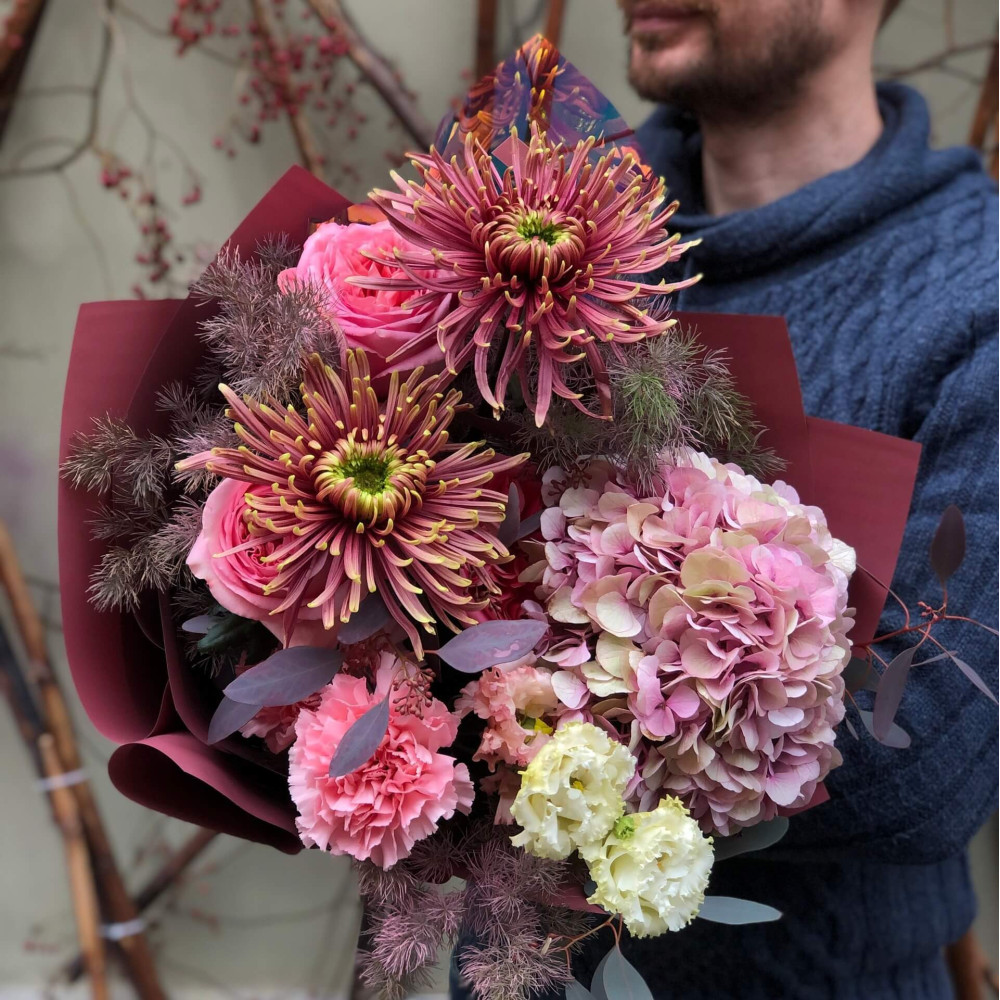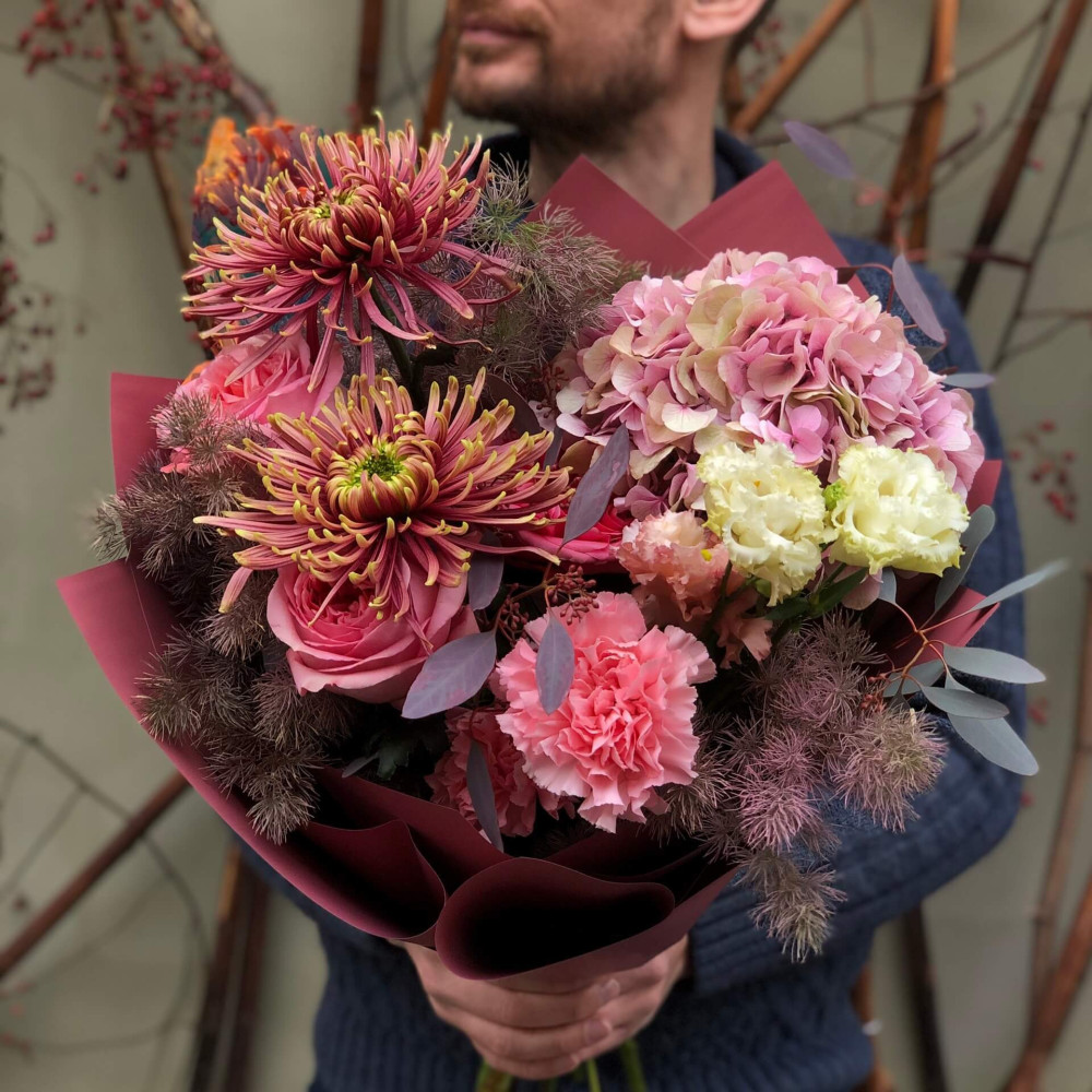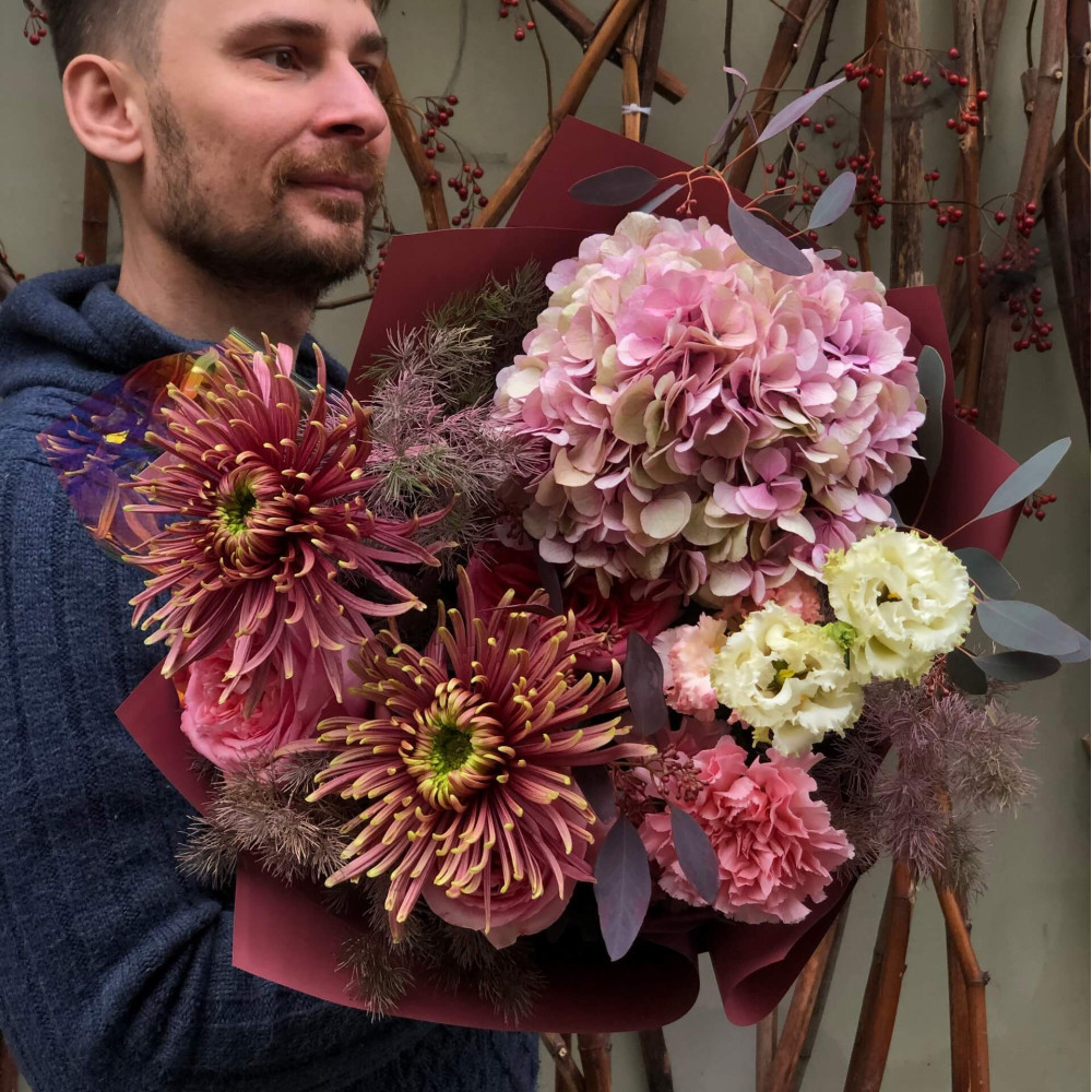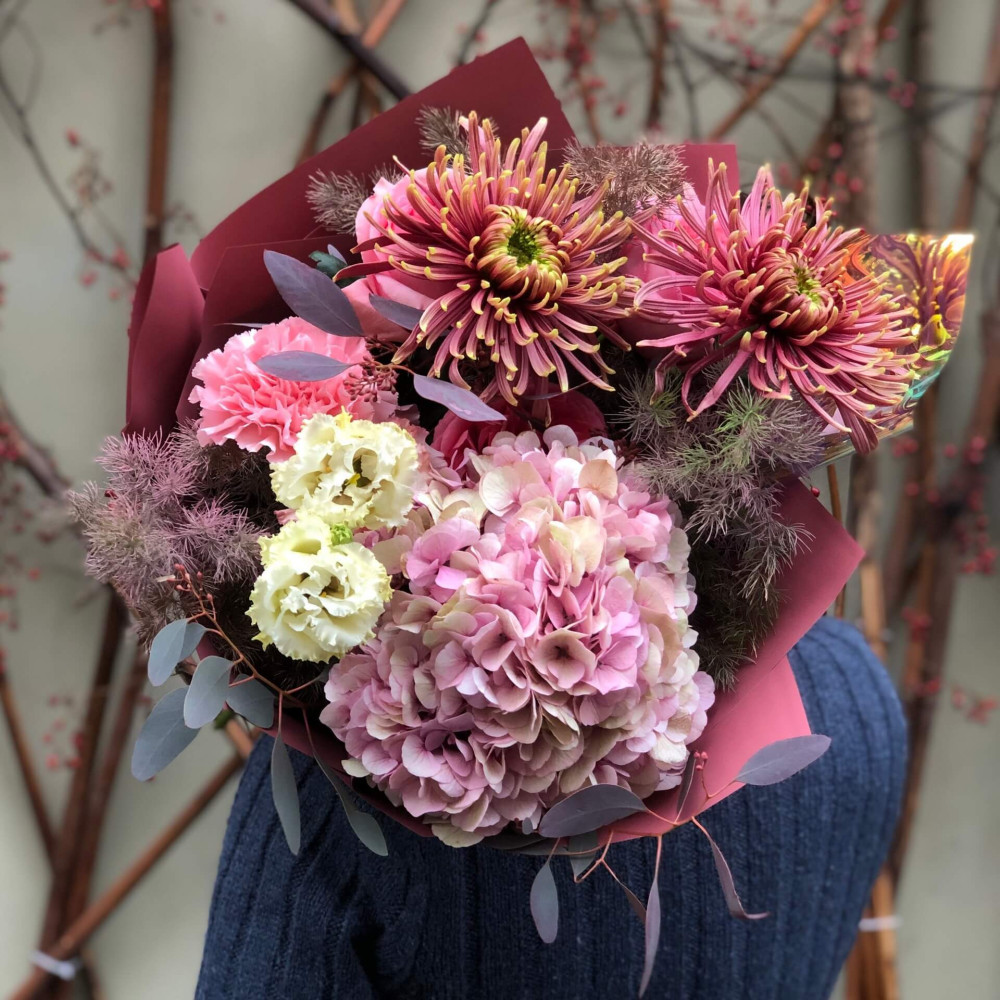 Квіти: Гортензія, Хризантема, Троянда піоновидна, Діантус (Гвоздика), Аспарагус, Еустома, Евкаліпт