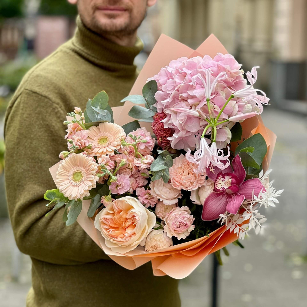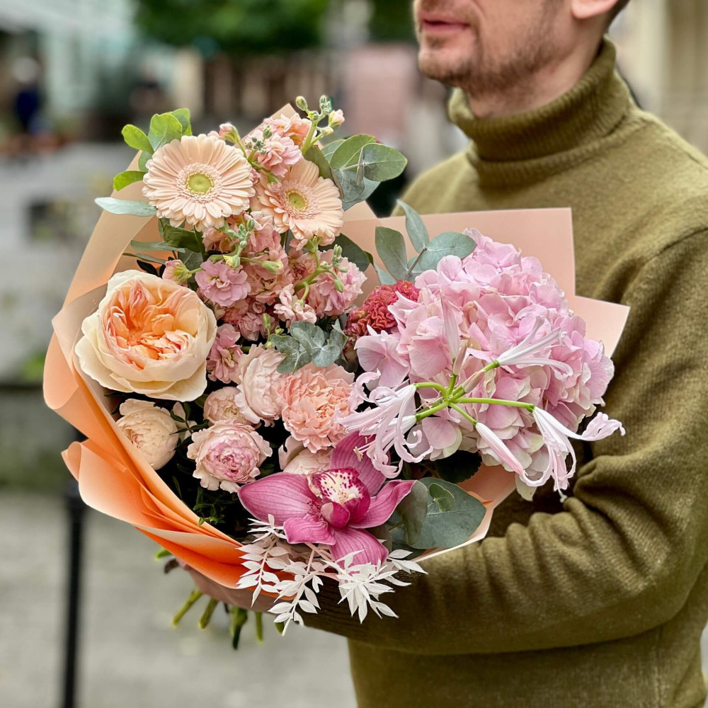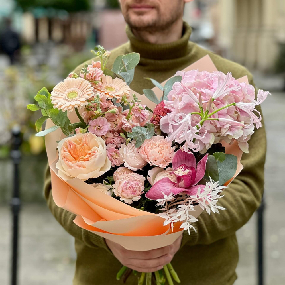 - Як замовити Пухкий романтичний букет з піоновидною трояндою Juliet та кущовою матіолою «Персикова радість»? ❯